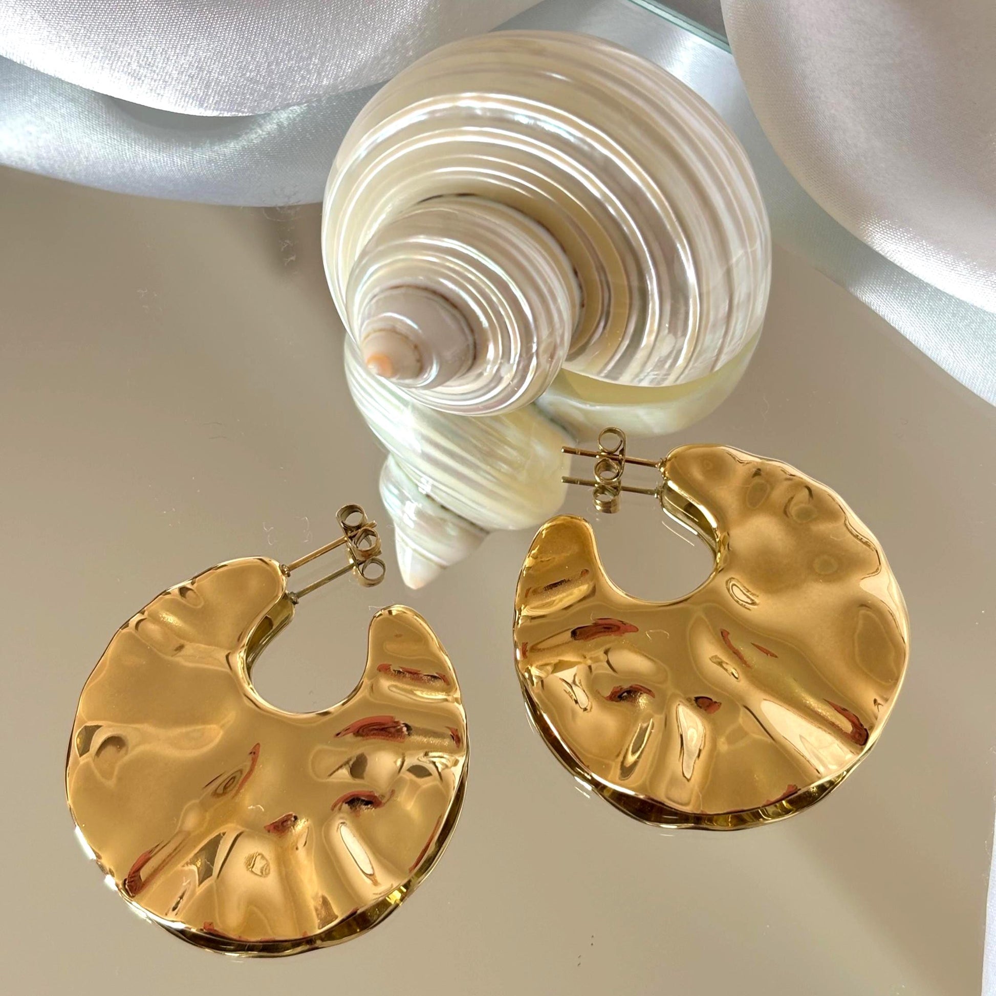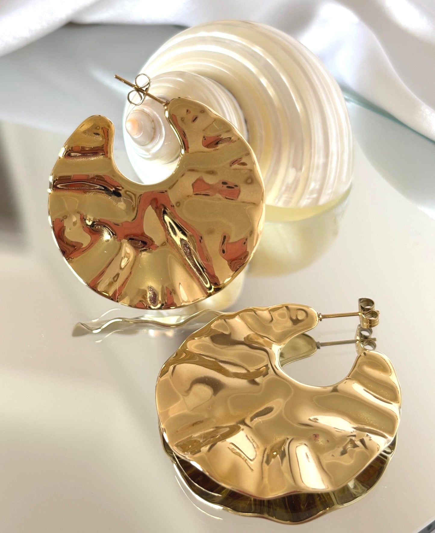 Boucles d'oreilles type créoles en acier inoxydable composées d'un anneau plat martelé.