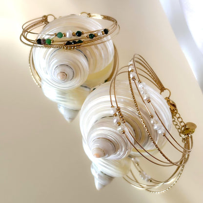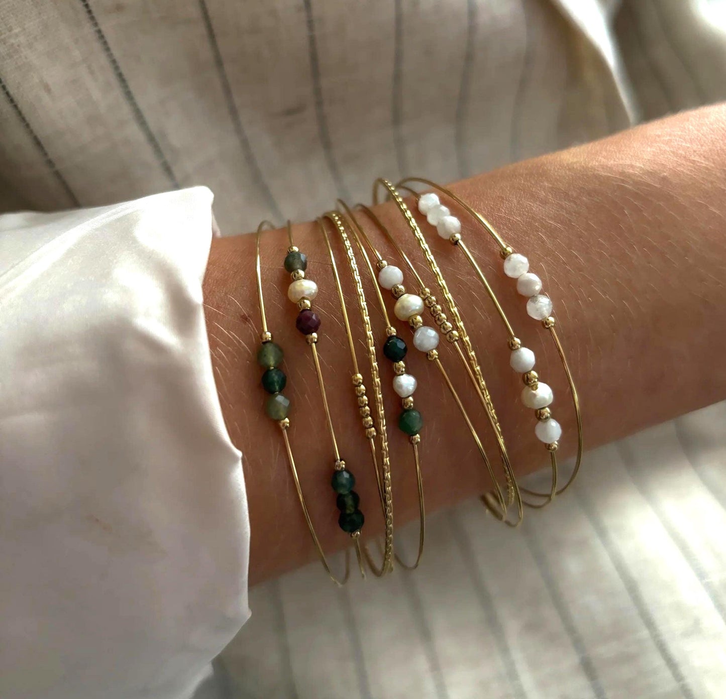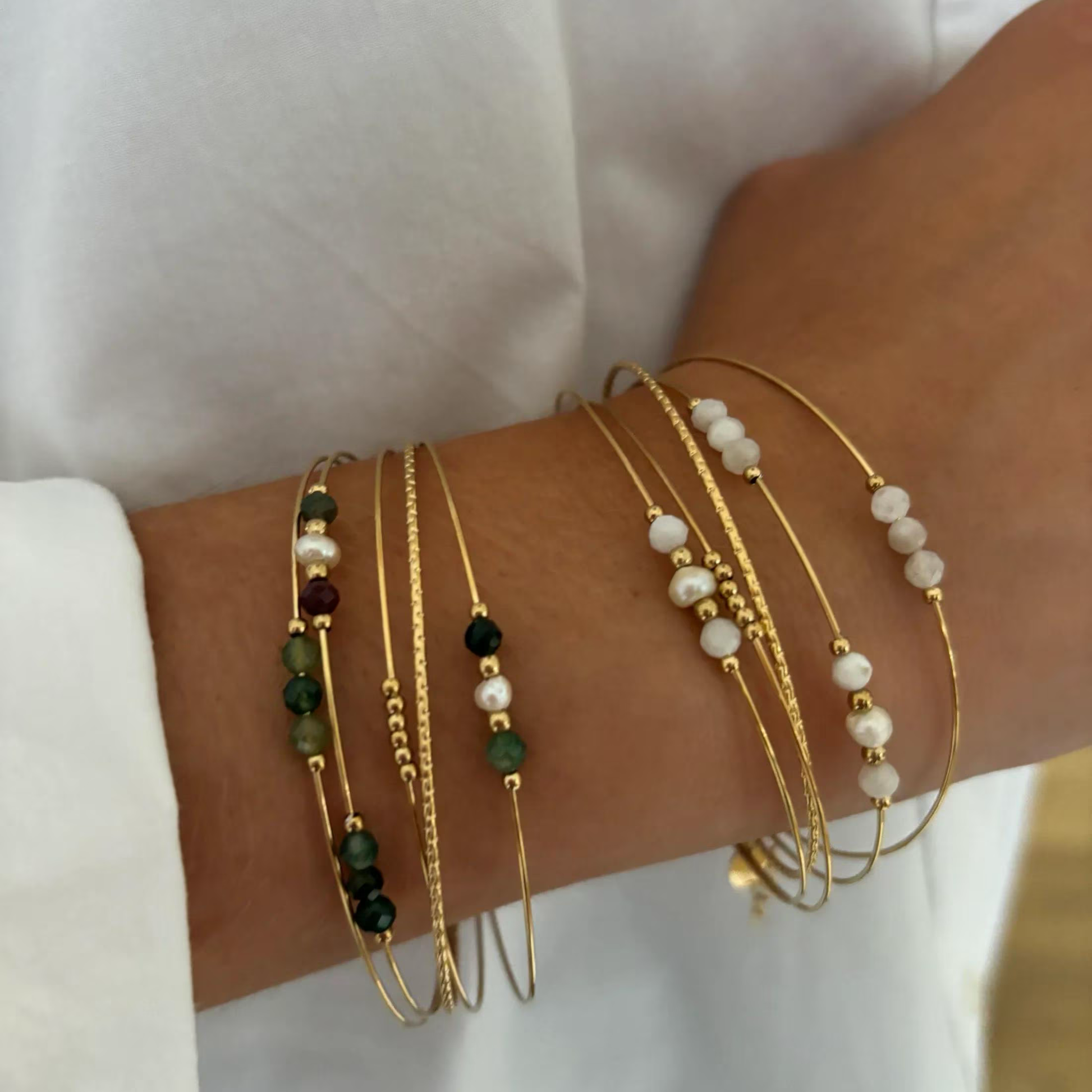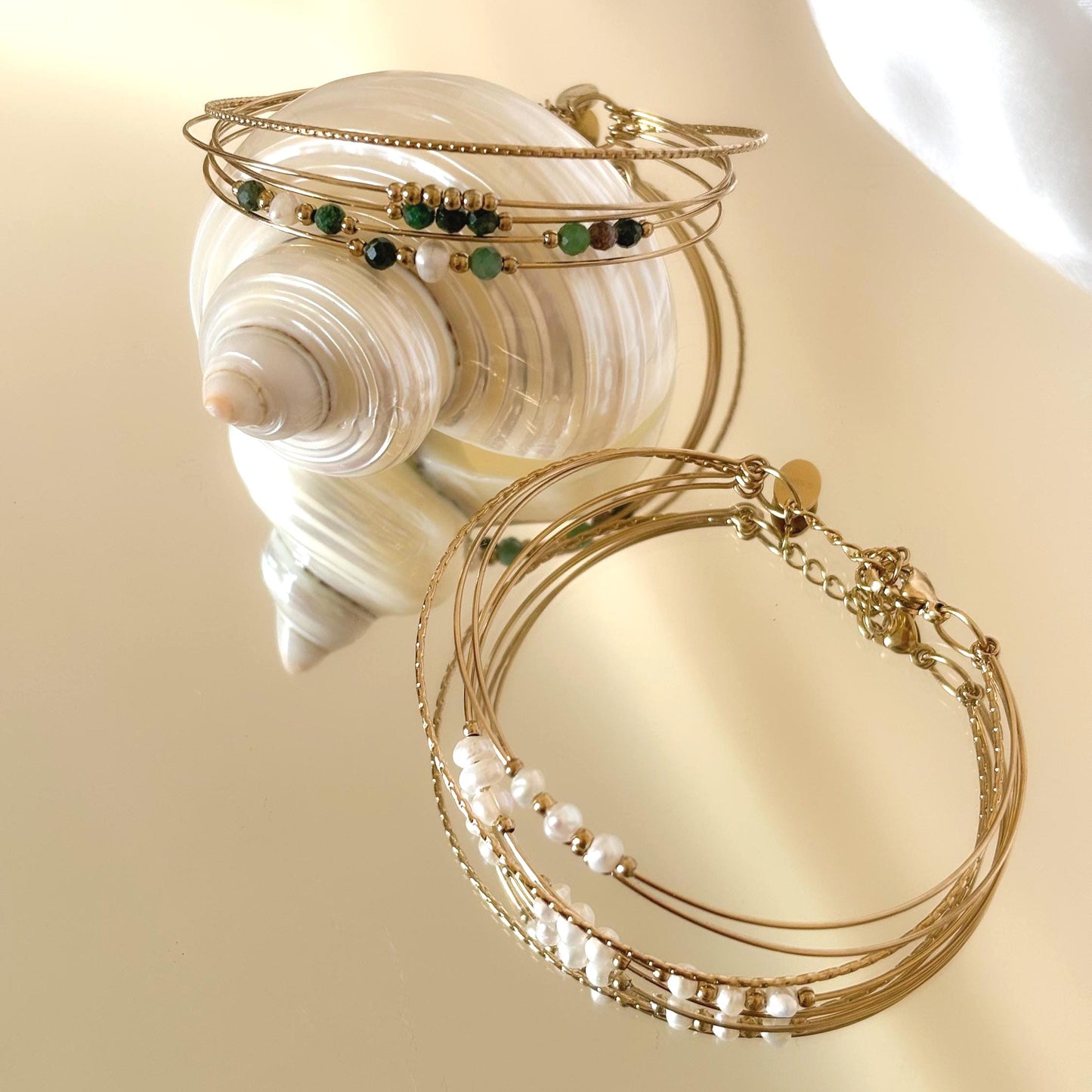 Le bracelet LAGUNE séduit par son design élégant et texturé. Composé de 5 anneaux fins en acier inoxydable aux nervures dentelées, il est sublimé par des pierres naturelles et perles délicates.