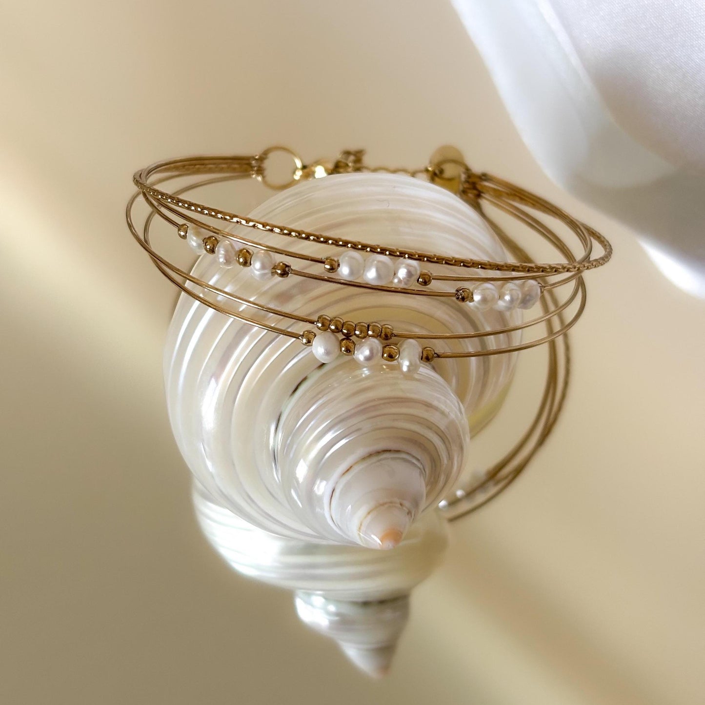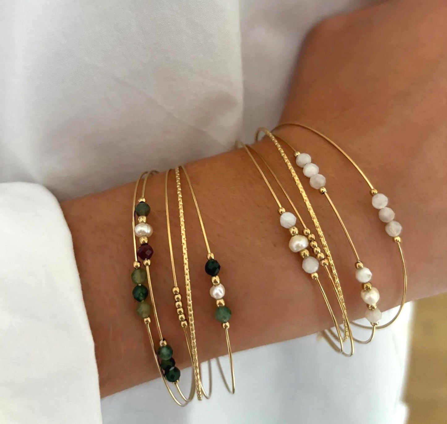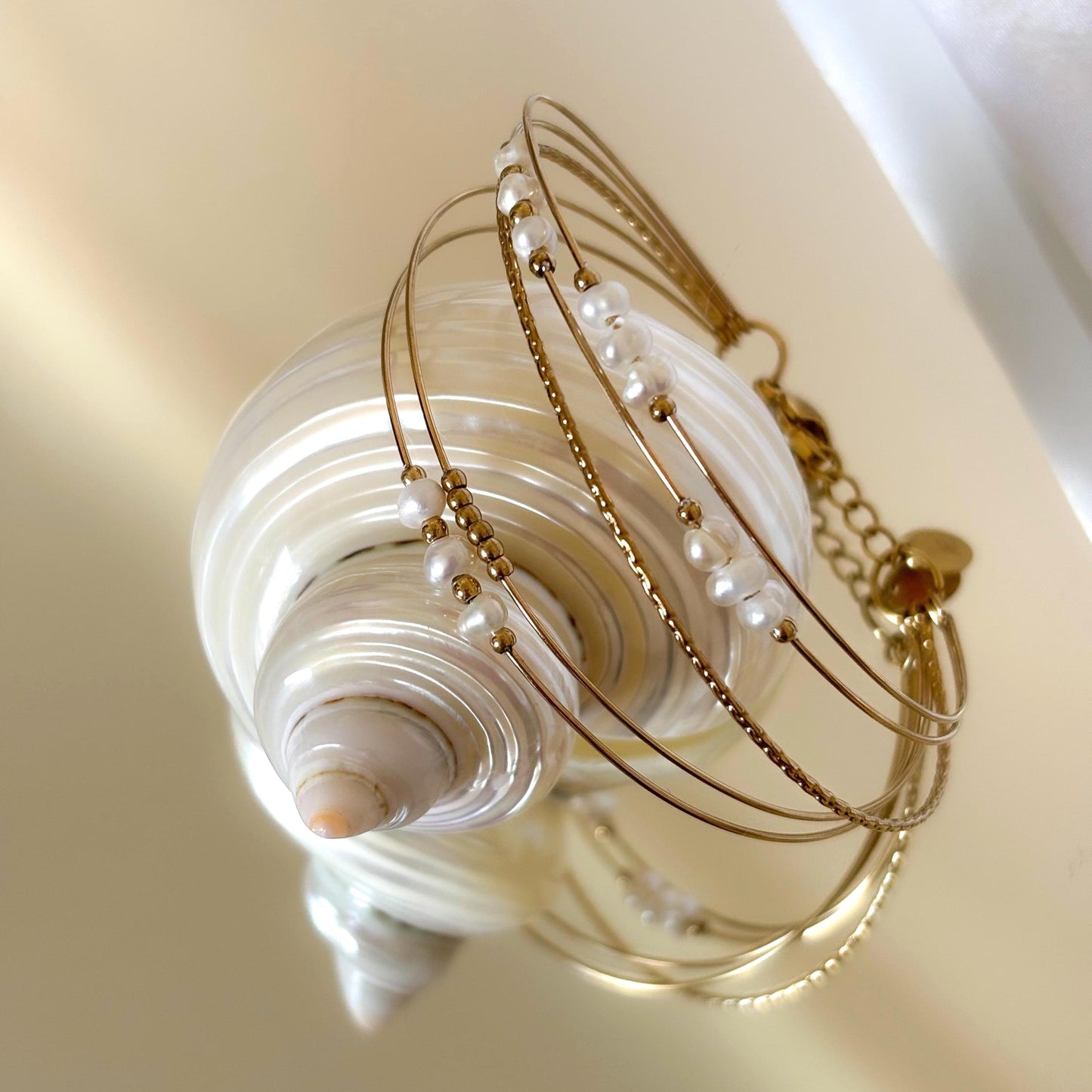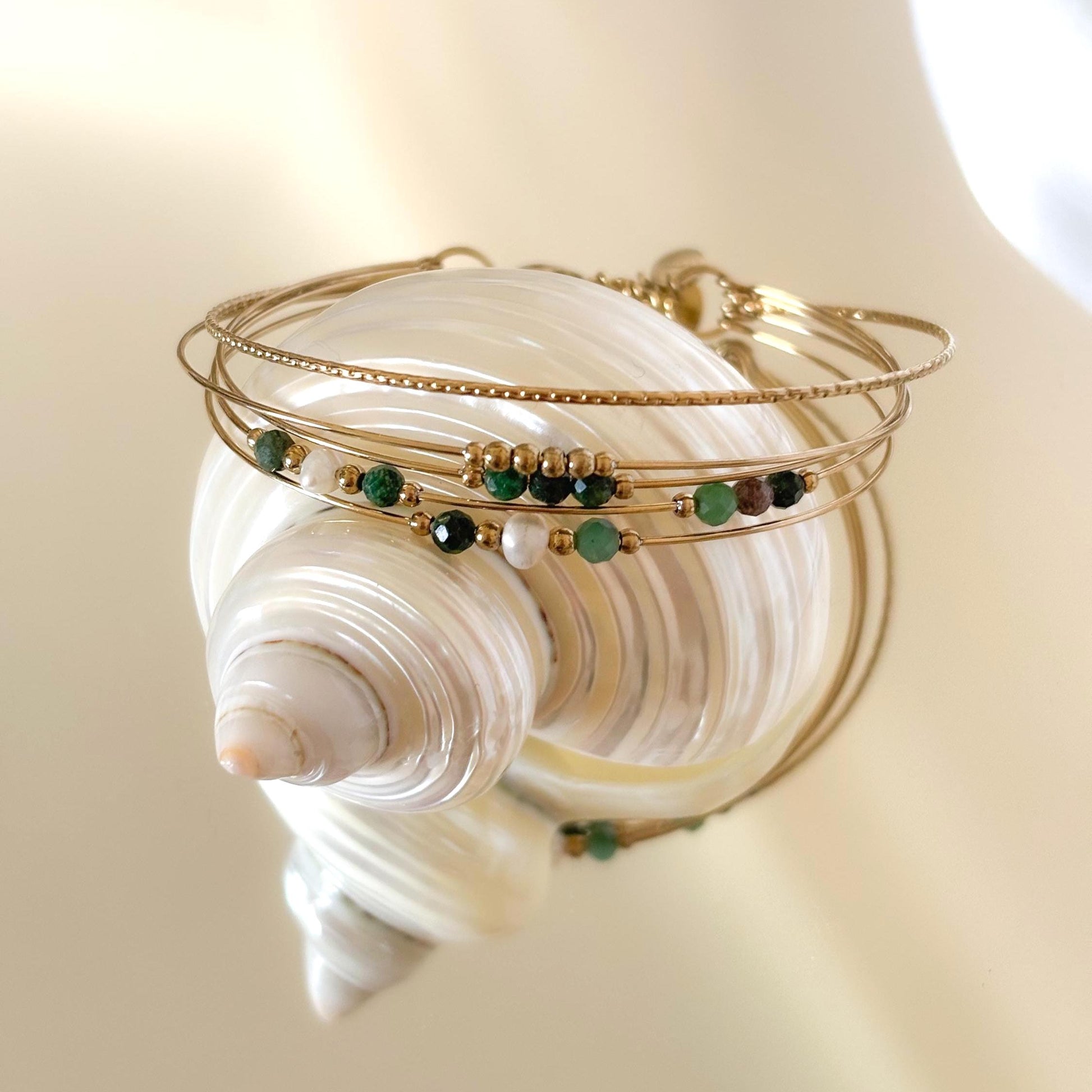 Le bracelet LAGUNE séduit par son design élégant et texturé. Composé de 5 anneaux fins en acier inoxydable aux nervures dentelées, il est sublimé par des pierres naturelles et perles délicates.