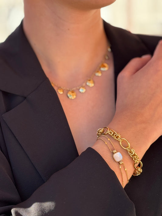 Des bracelets, colliers, bagues et boucles d'oreilles, délicatement dorés alliant modernité et élégance intemporelle.