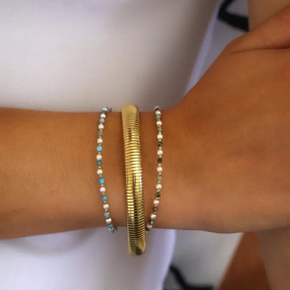 Bracelet sur câble orné de pierres naturelles et de perles de nacre.