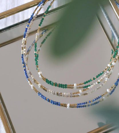 Le collier ORIGINE marie agate verte, jaspe, sodalite et perles d’eau douce pour un bijou chargé d’énergie positive.