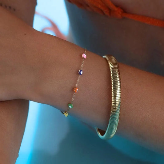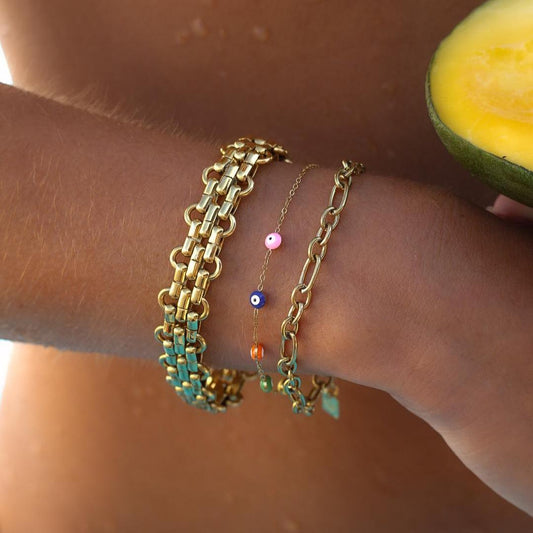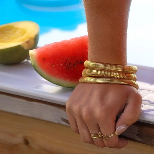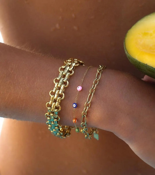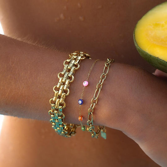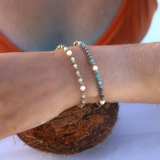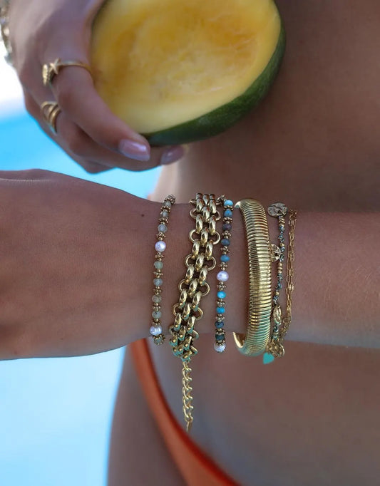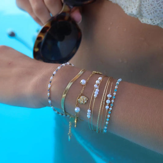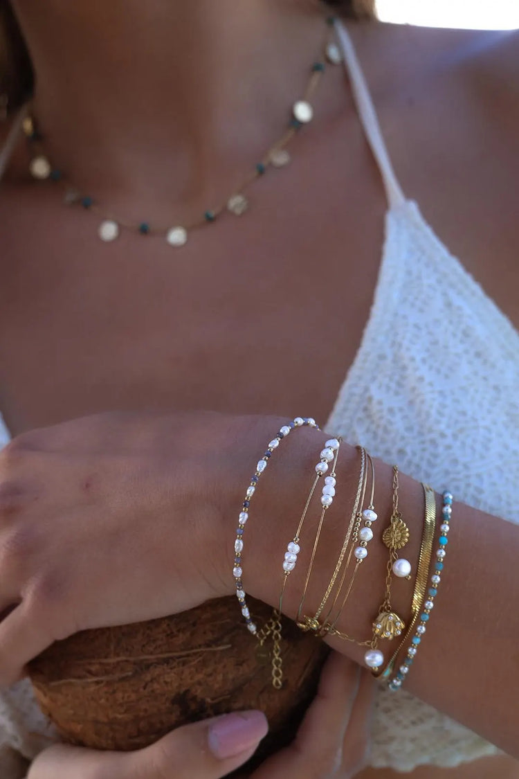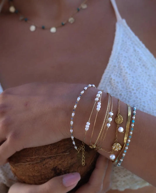 Nos pièces fines, délicatement travaillées et serties de pierres naturelles, se portent seules ou s'accumulent à l'infini pour sublimer votre peau halée. Une invitation à goûter à chaque instant, tout simplement.