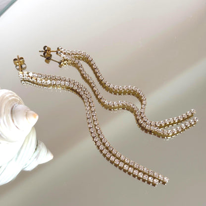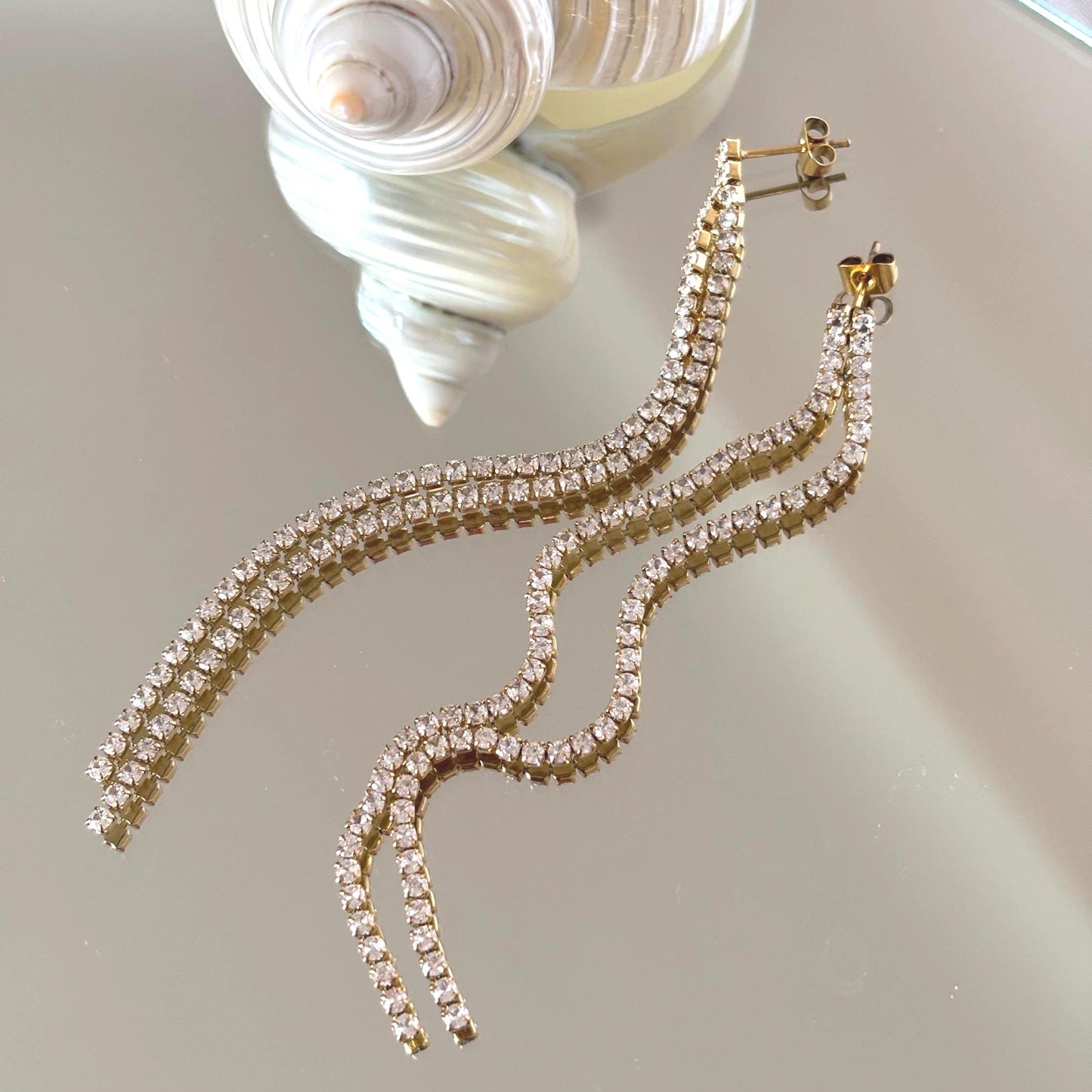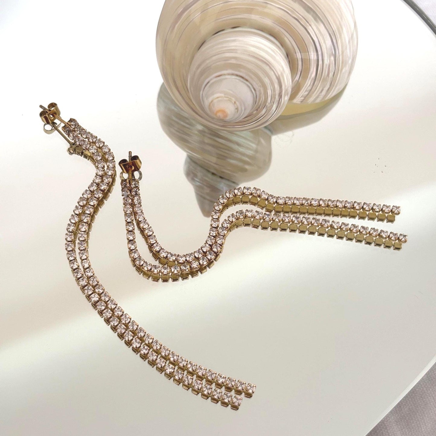 Composées de deux brins de strass scintillants, elles illuminent le visage avec légèreté et raffinement. Fabriquées en acier inoxydable doré, elles sont résistantes à l’eau, durables et hypoallergéniques, parfaites pour les peaux sensibles.