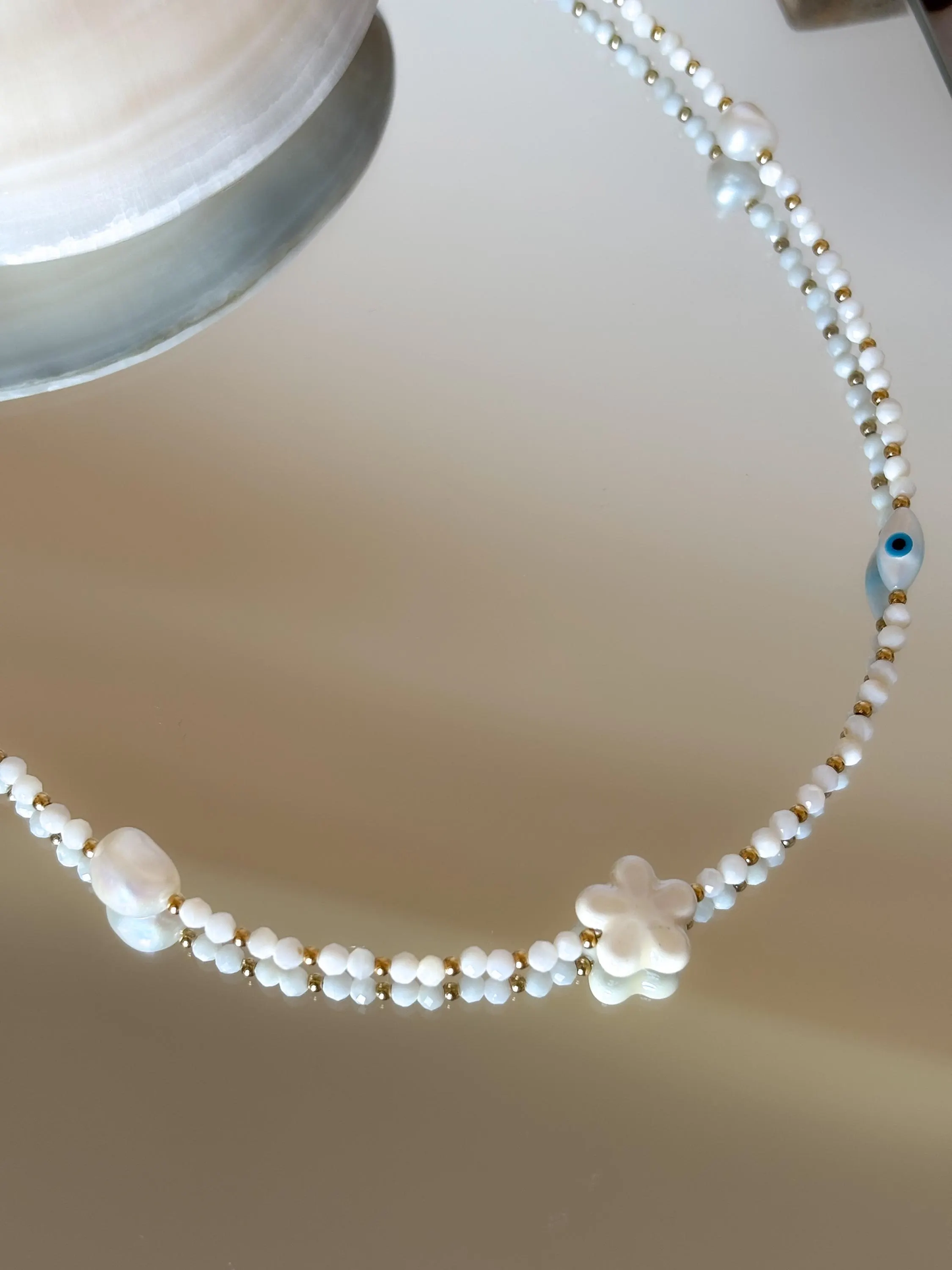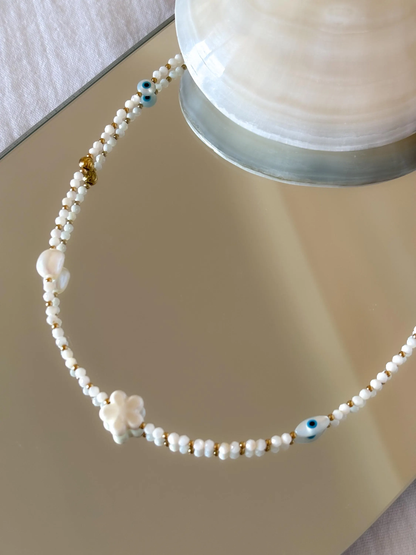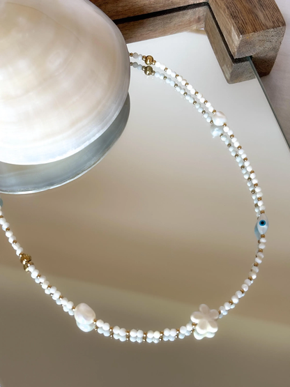 Collier sur câble, type ras de cou orné de perles de nacre, agrémentée de perles fleur et œil de protection.
