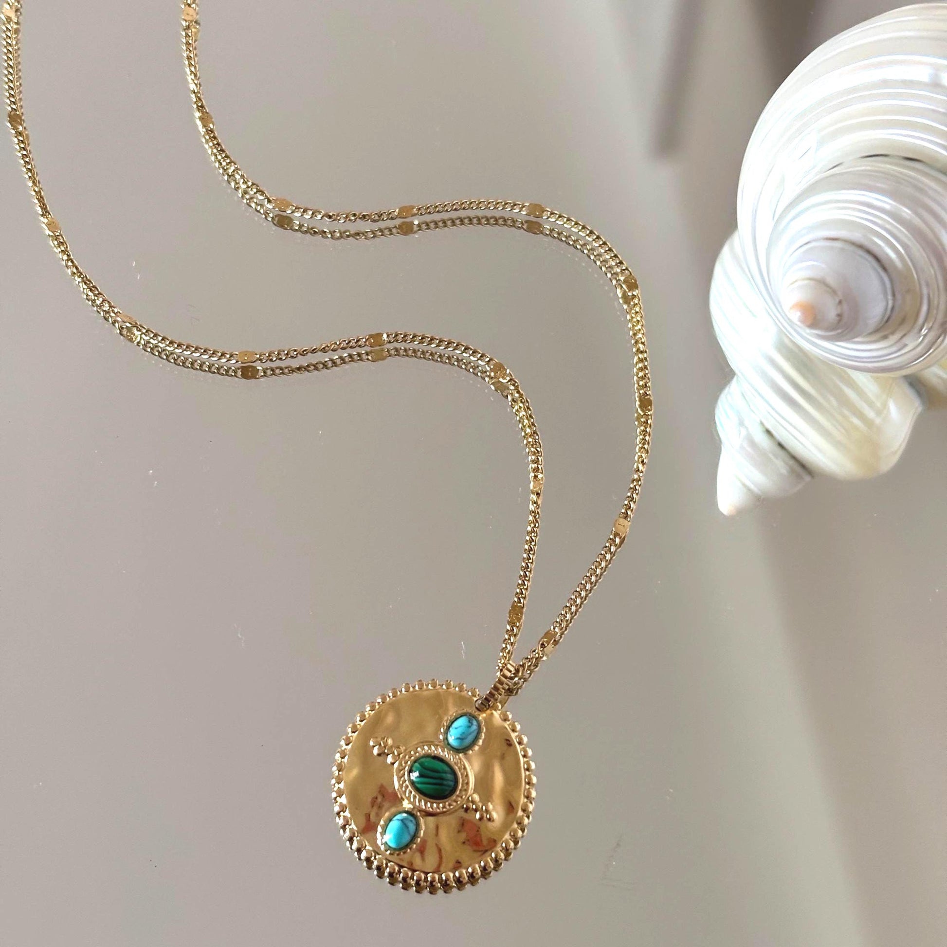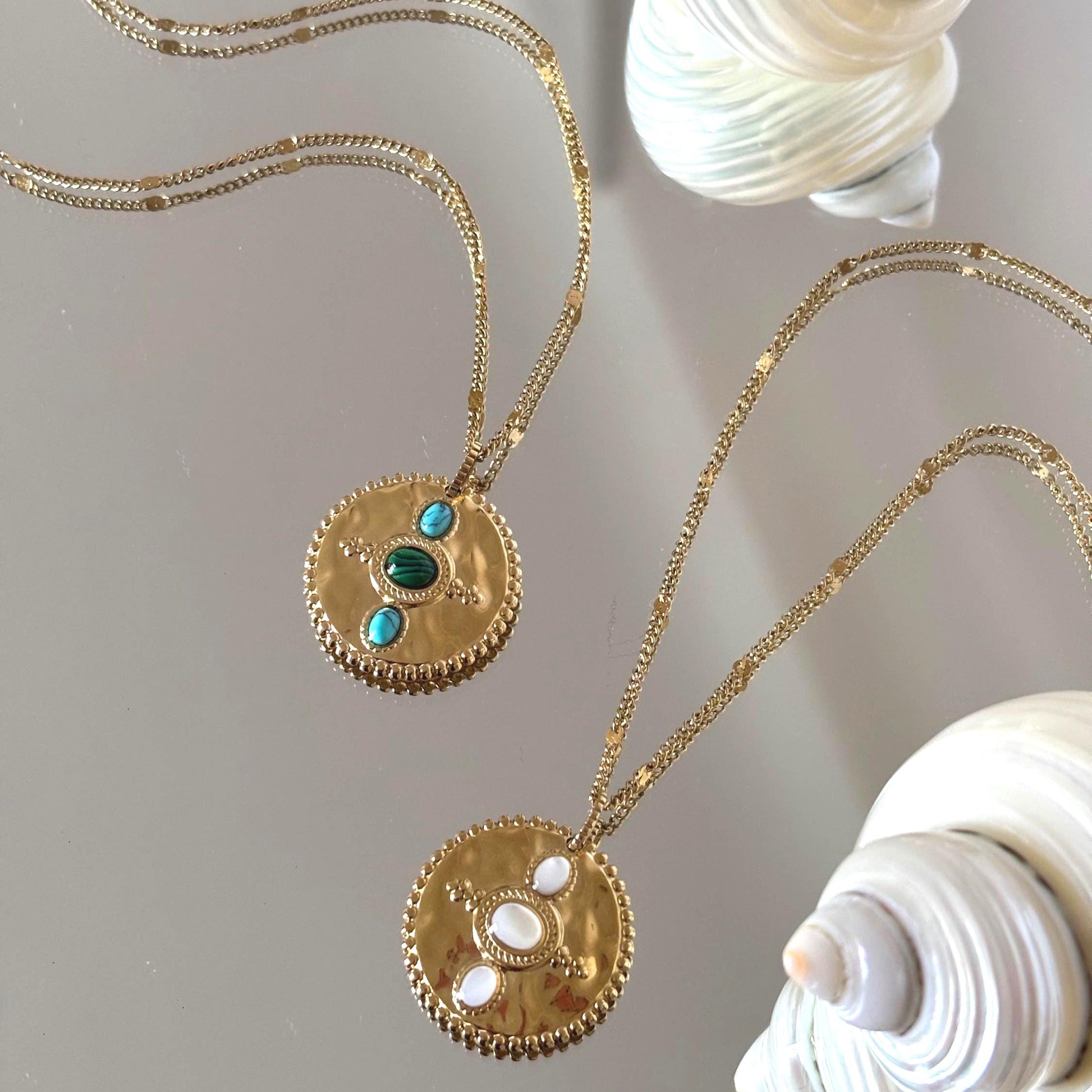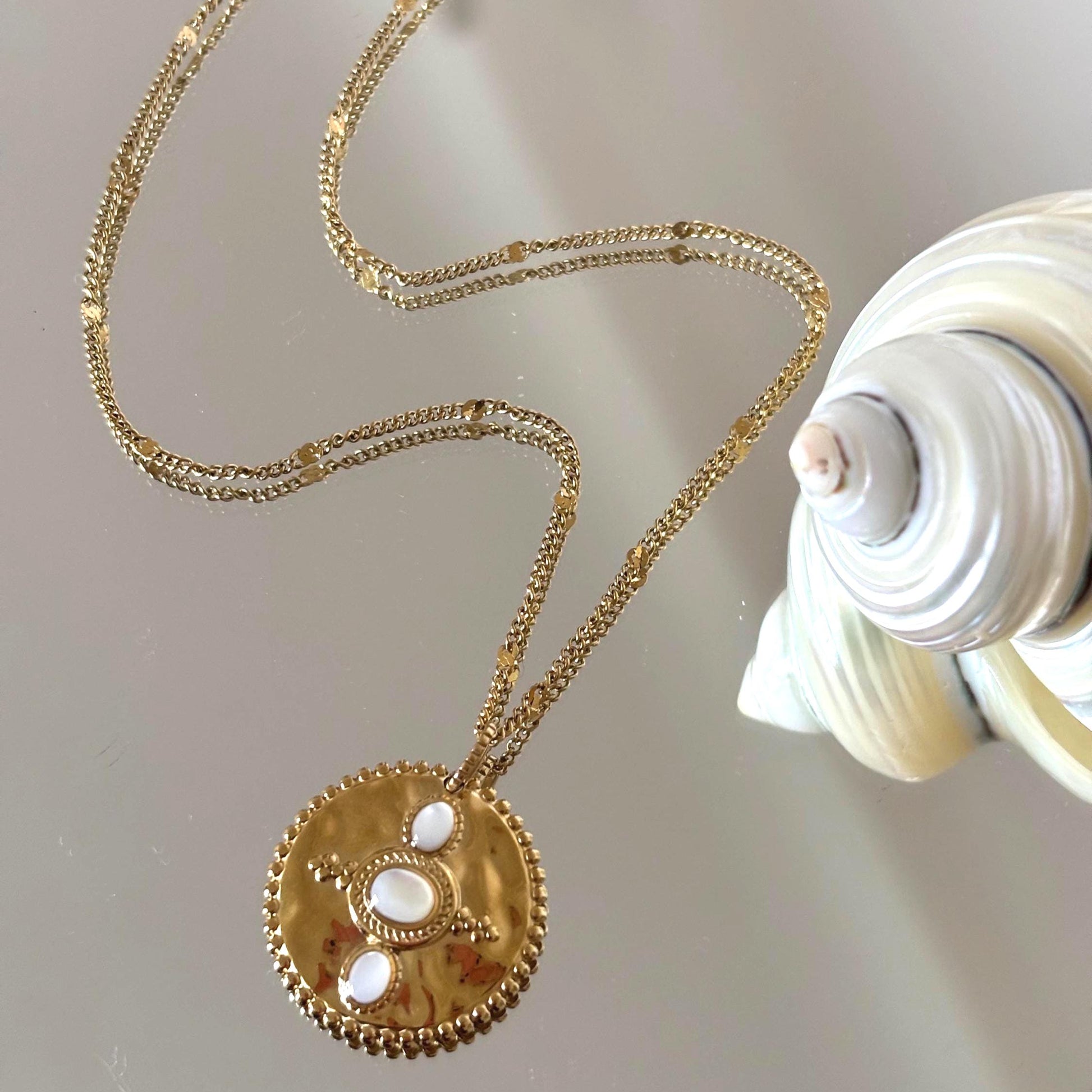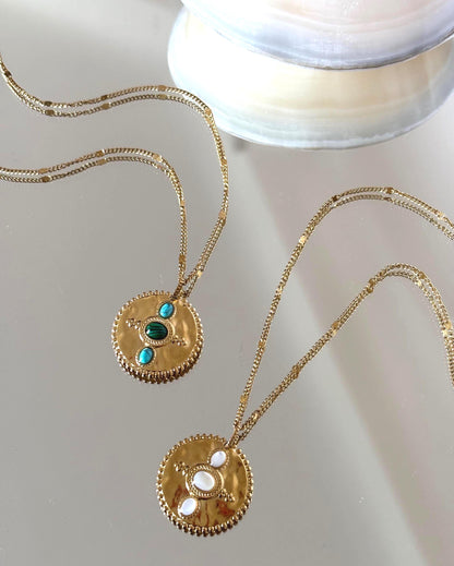 Le collier OREA illumine le décolleté avec son médaillon martelé doré orné de pierres naturelles de nacre et d’howlite.