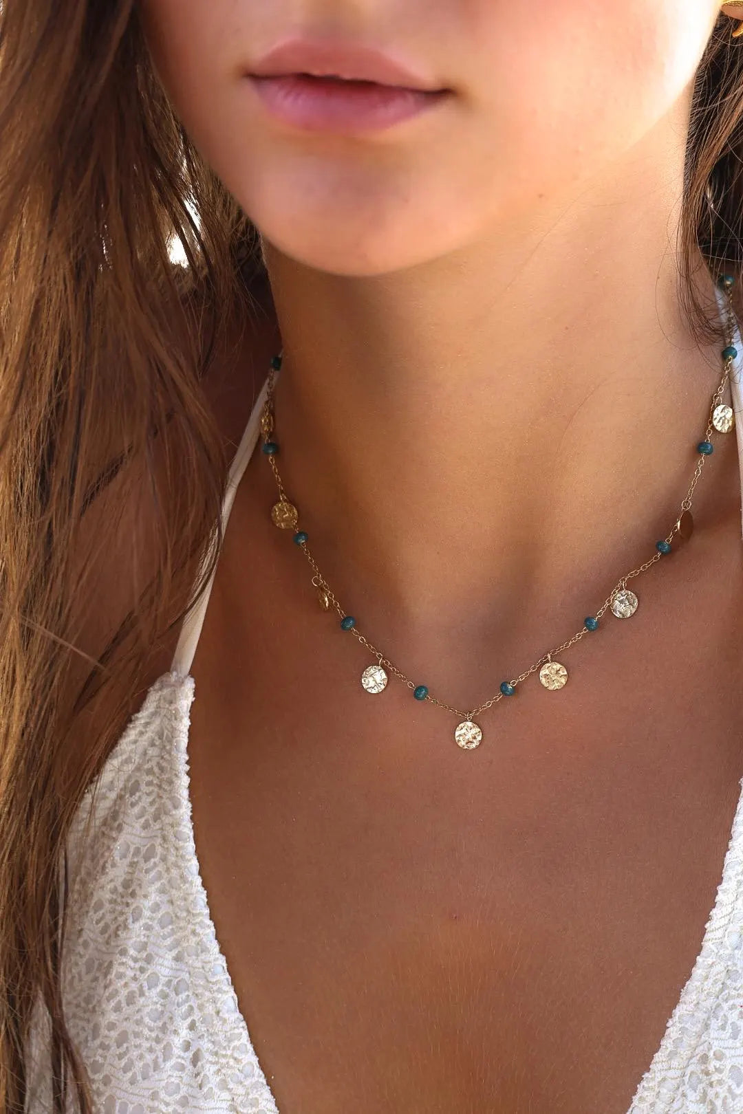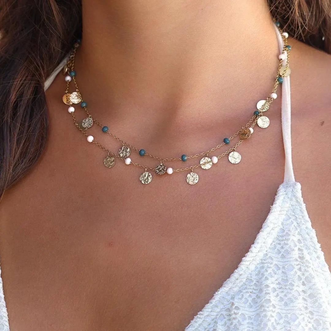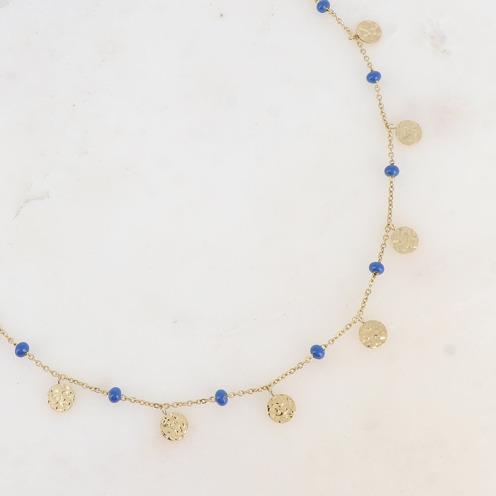 Le collier AMAÏA allie élégance et raffinement avec sa chaîne dorée en acier inoxydable, ses boules émaillées et ses pampilles martelées.