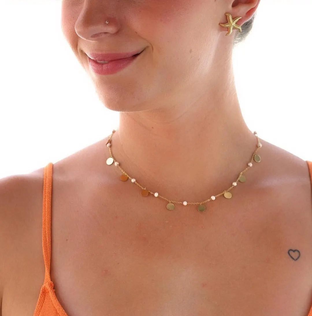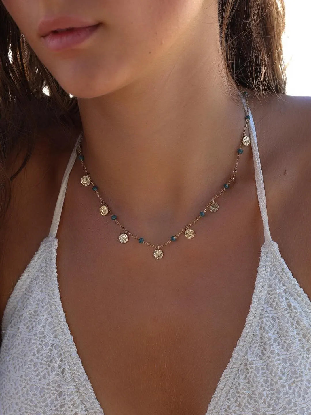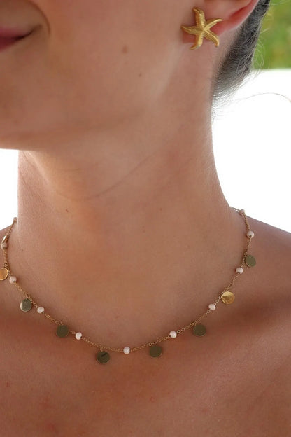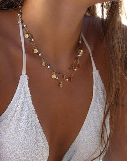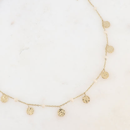 Le collier AMAÏA allie élégance et raffinement avec sa chaîne dorée en acier inoxydable, ses boules émaillées et ses pampilles martelées.