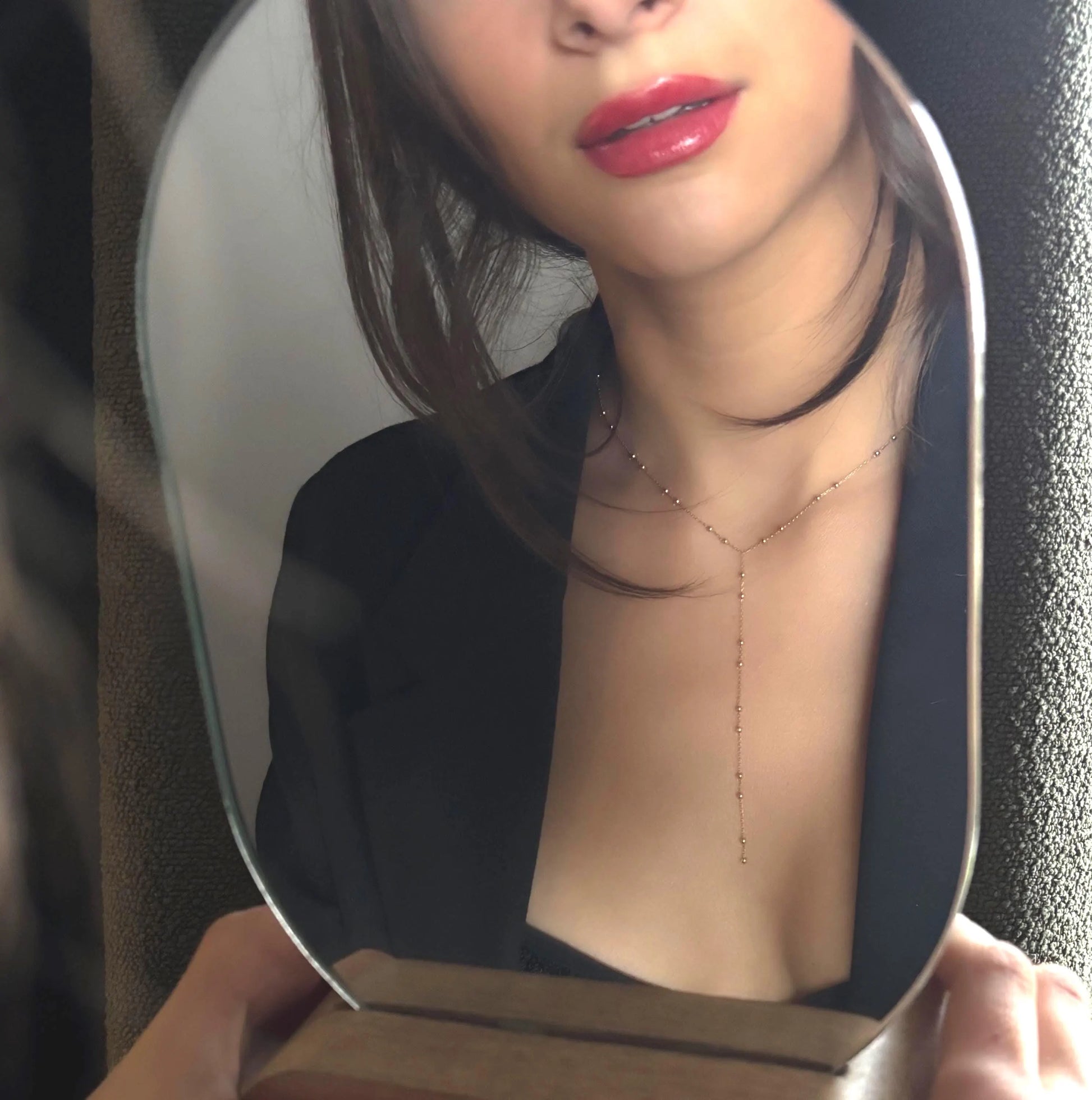 Le collier ELORIA est un collier lariat en plaqué or 18k composé d’une délicate chaîne Y ornée de perles dorées.