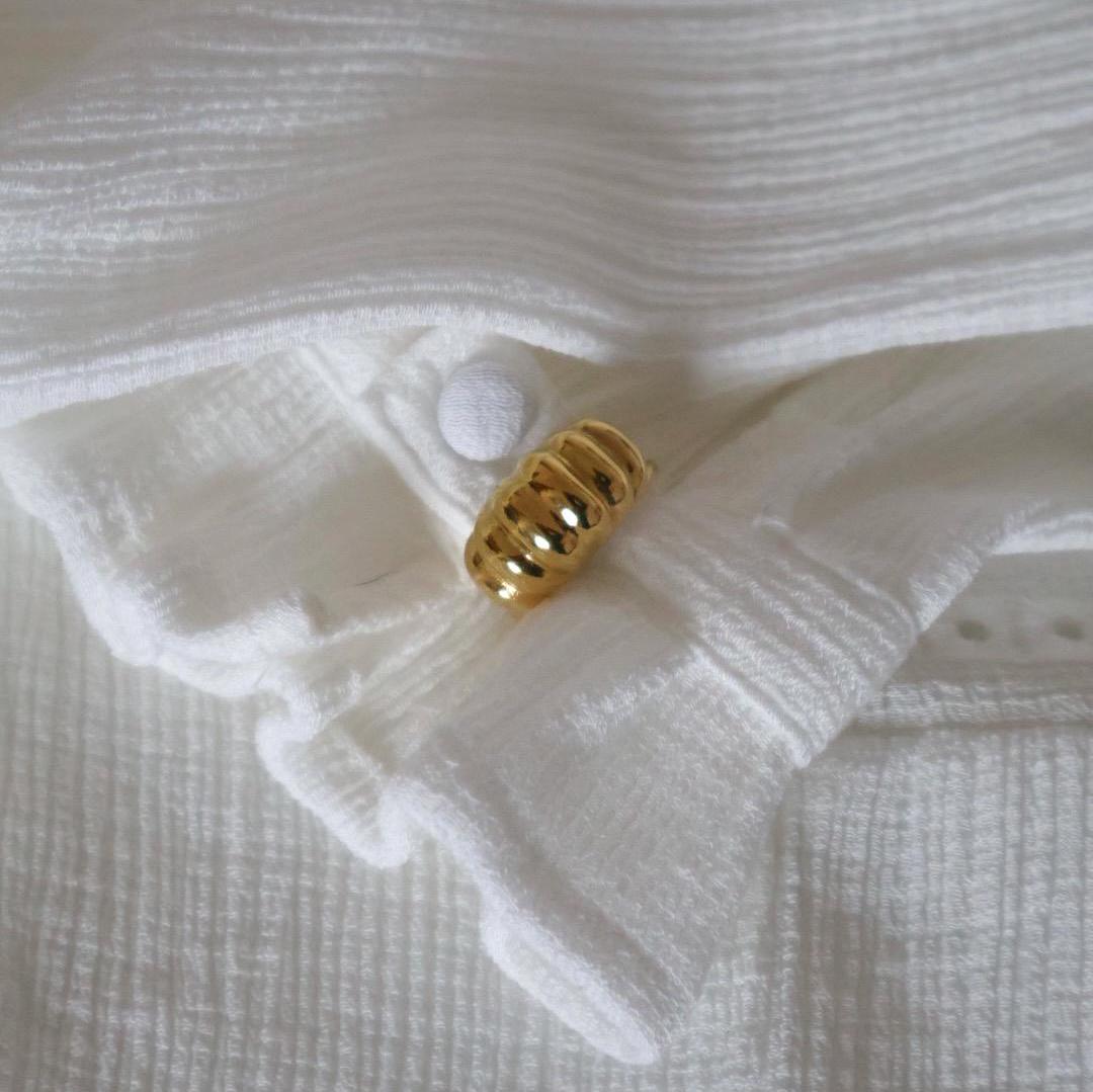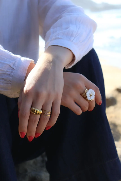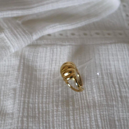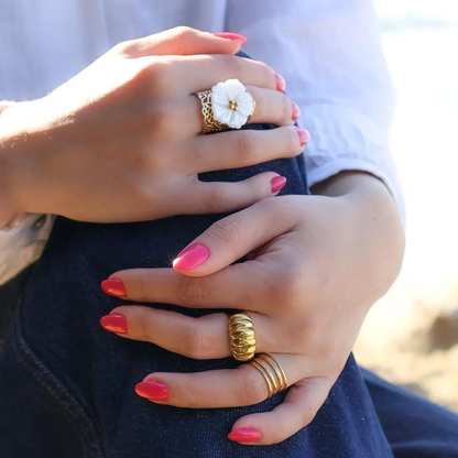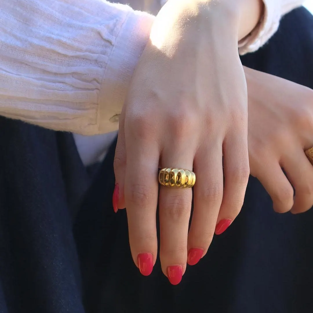 Bague en forme de coquillage en acier inoxydable composée d'un anneau à la formes bombée et striée.