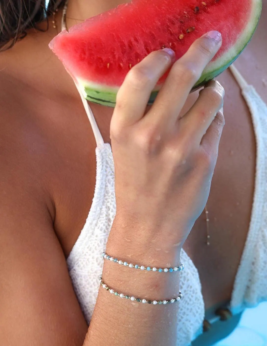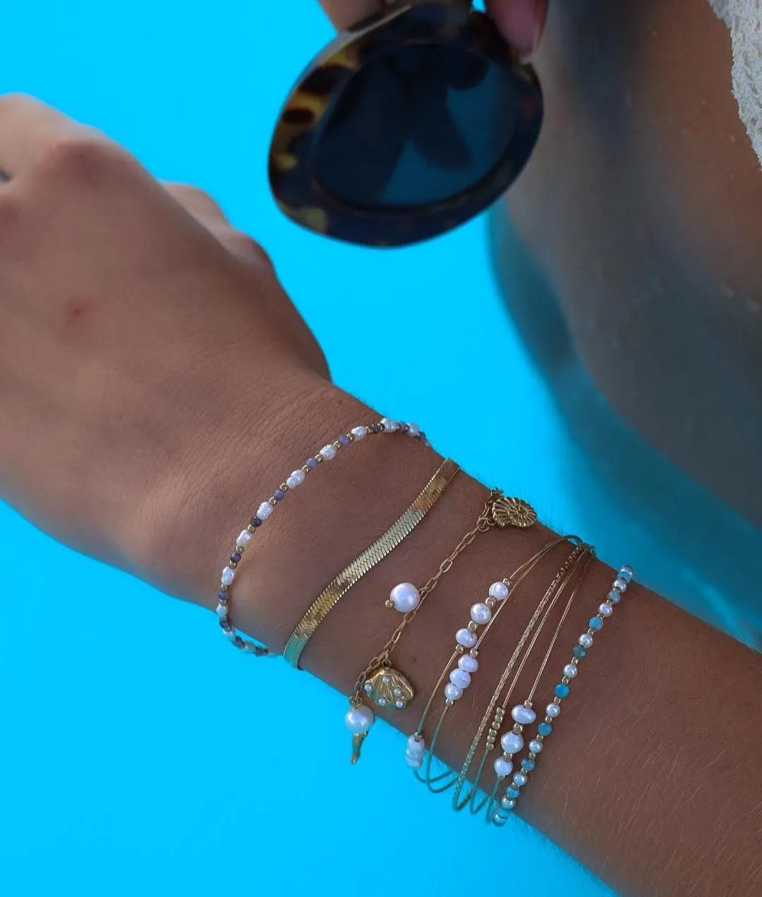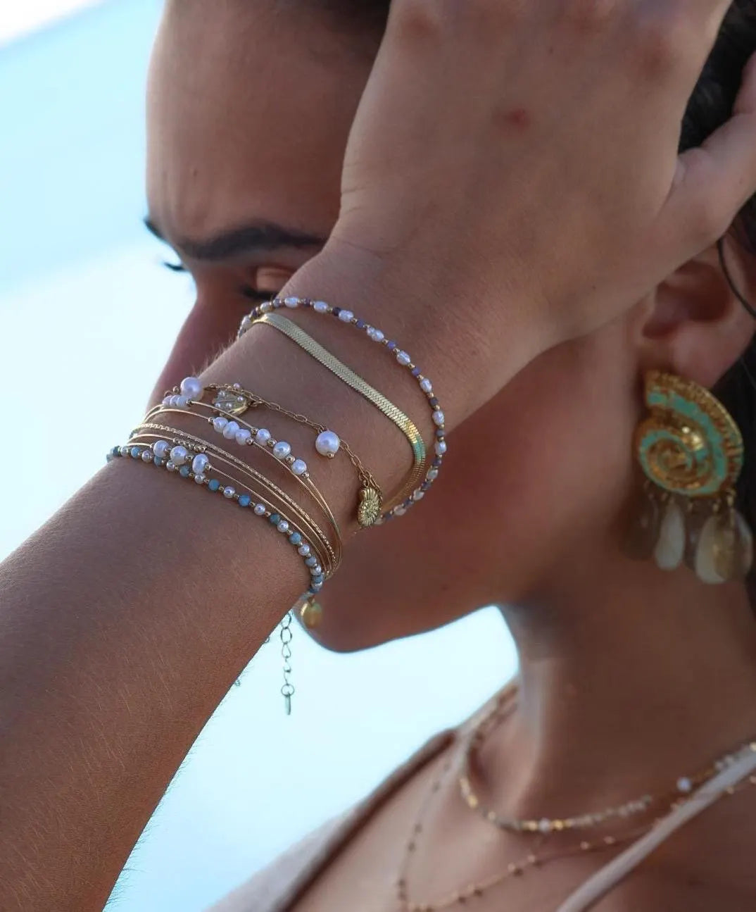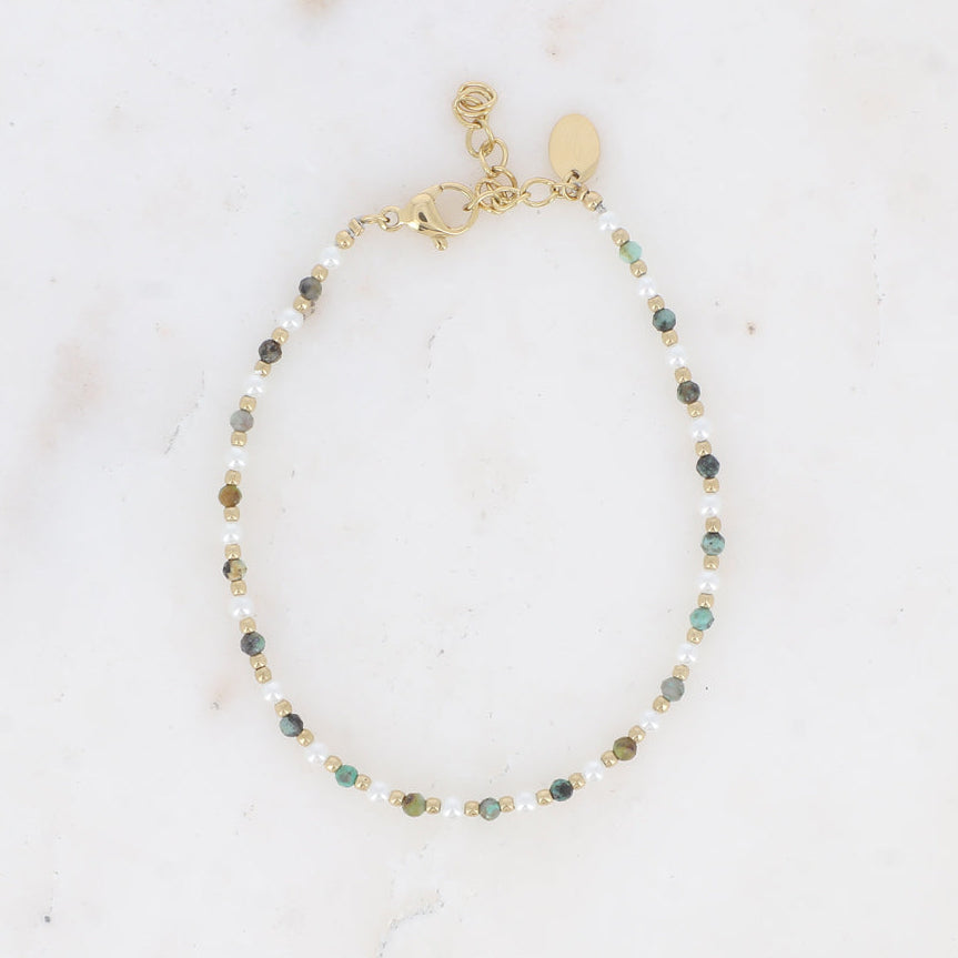 Bracelet sur câble orné de pierres naturelles et de perles de nacre.