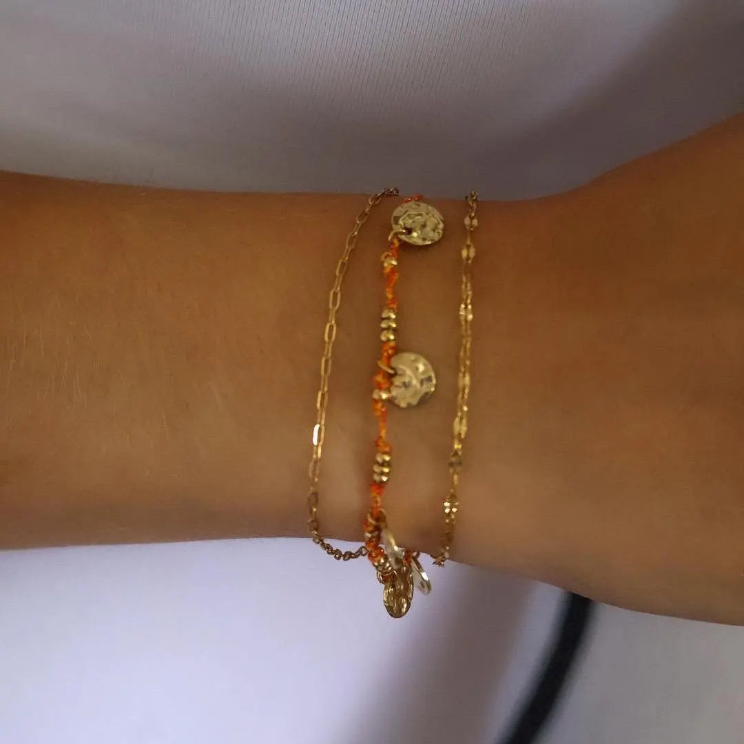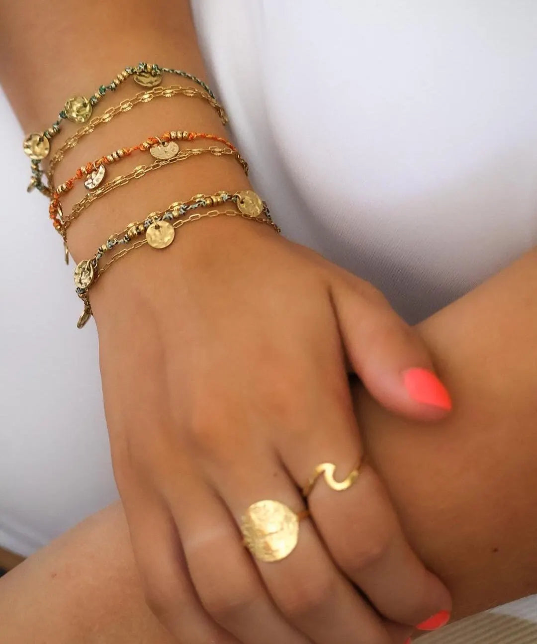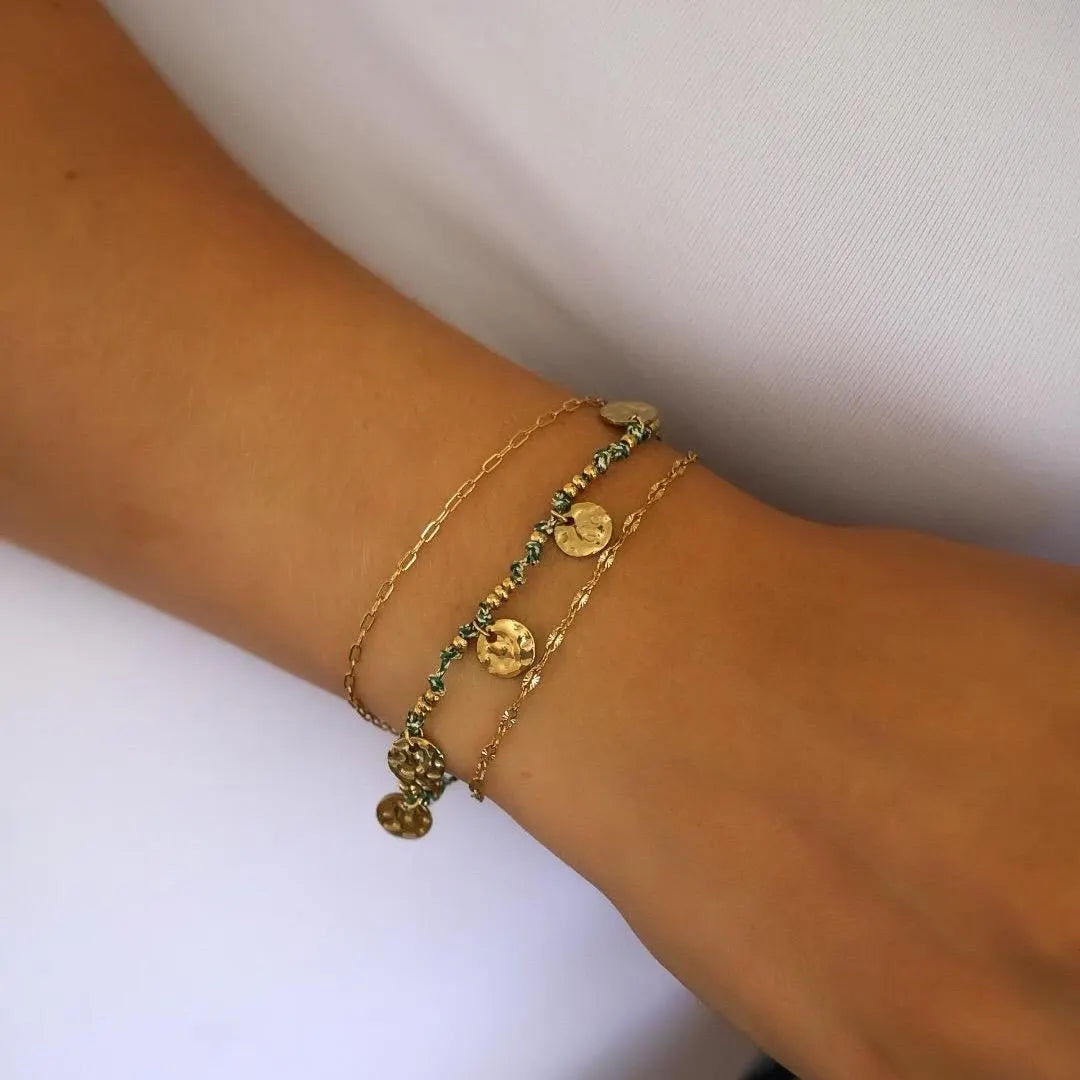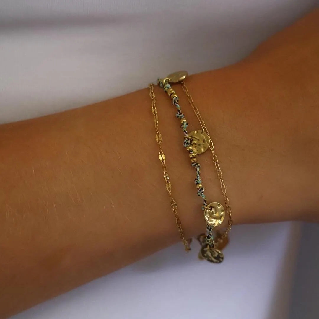 Bracelet 3 rangs en acier inoxydable composé d'un cordon coloré agrémenté de pampilles rondes martelées, un chaine maille rectangulaire et une chaine grain de café.