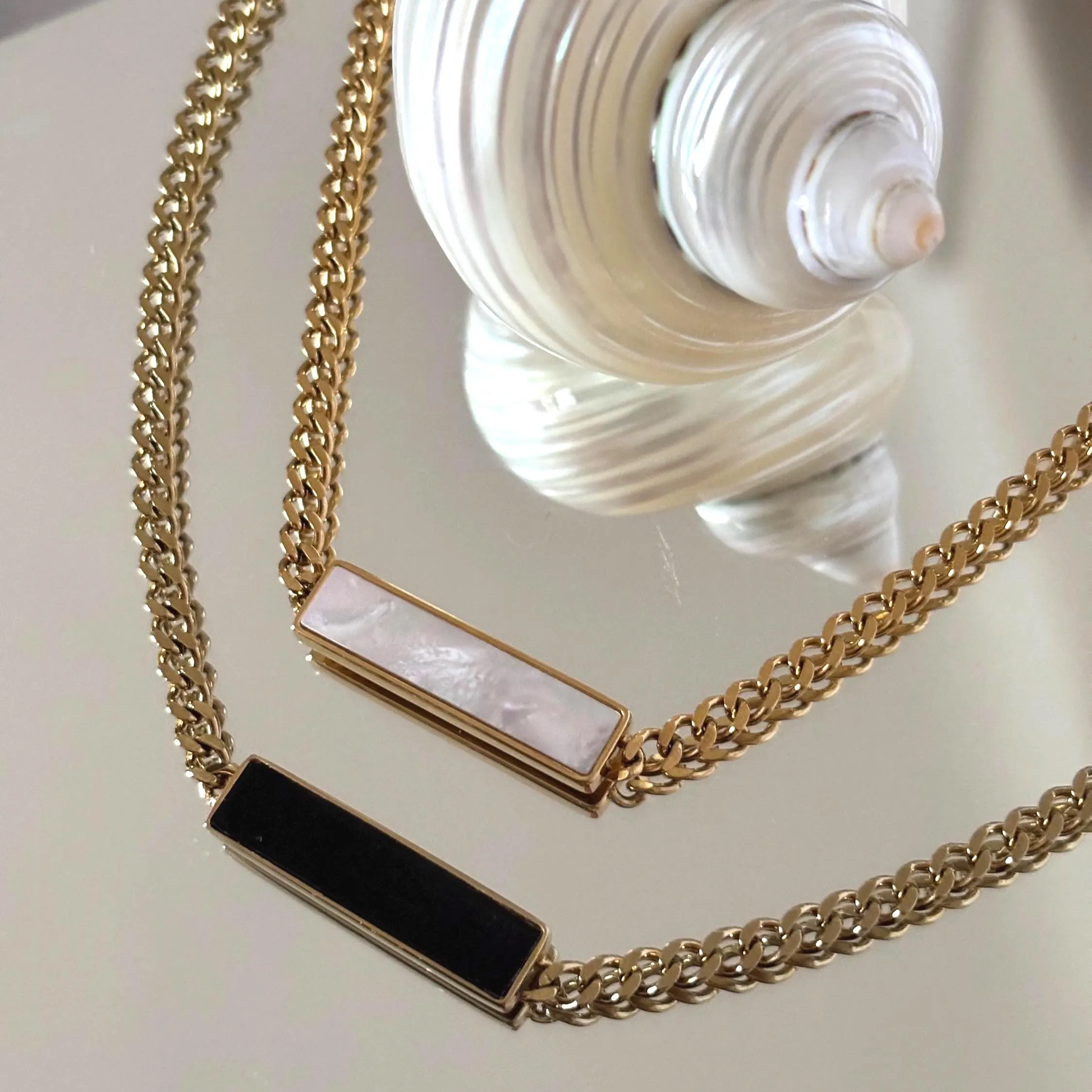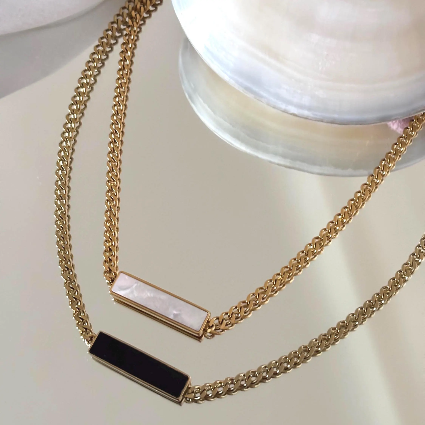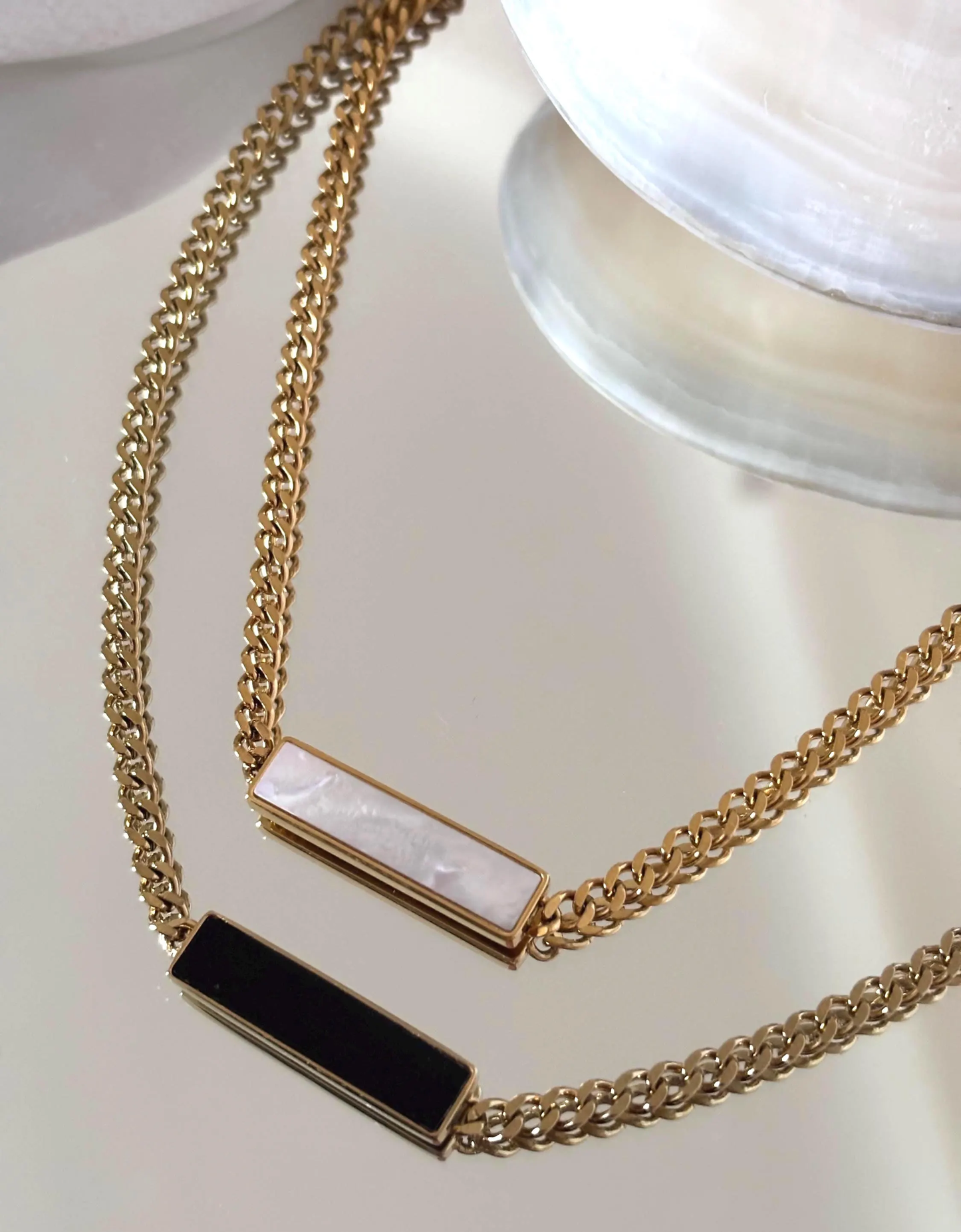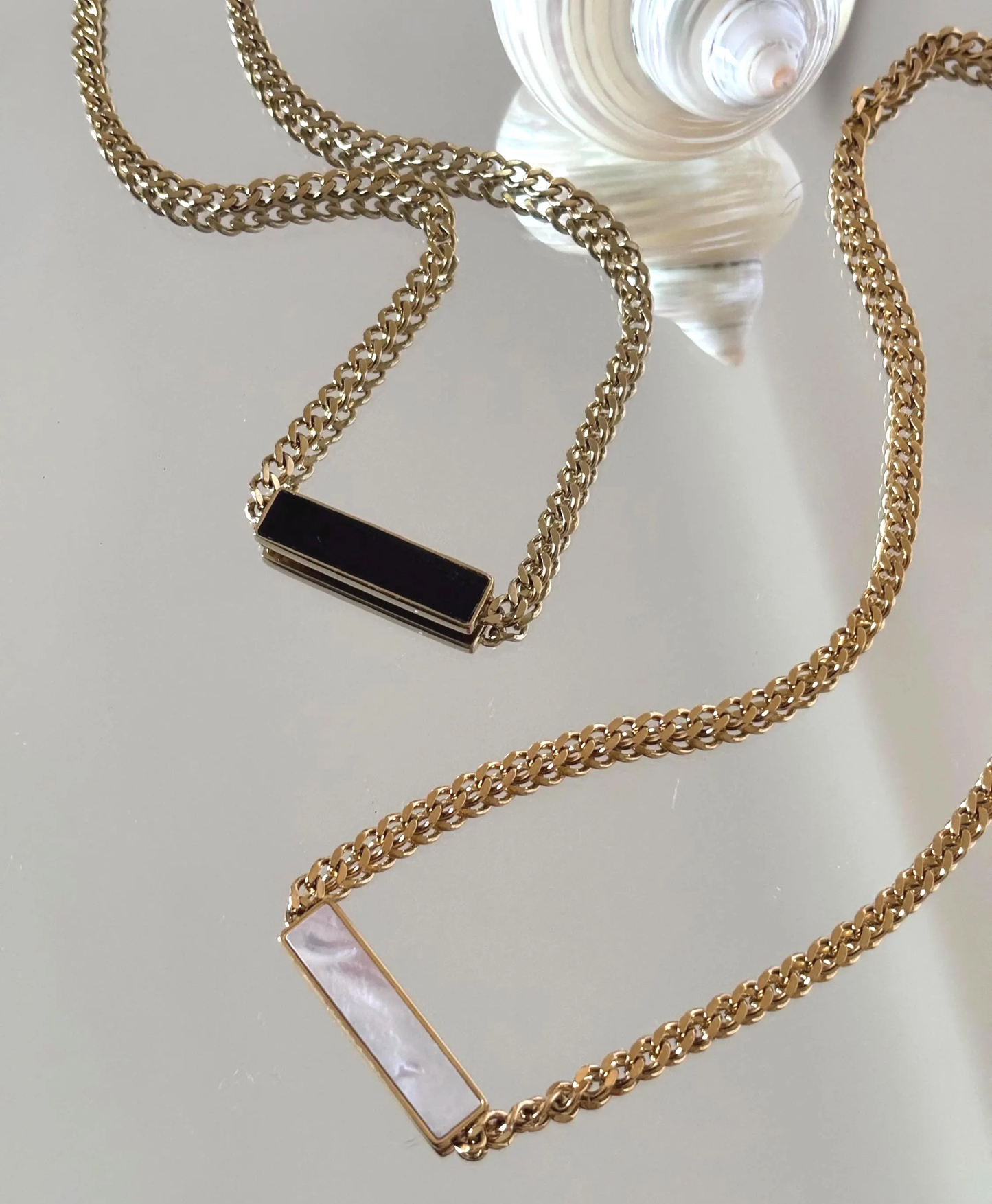 Il est composé d'une chaîne maille gourmette en acier inoxydable doré et d'une plaque en résine au centre.