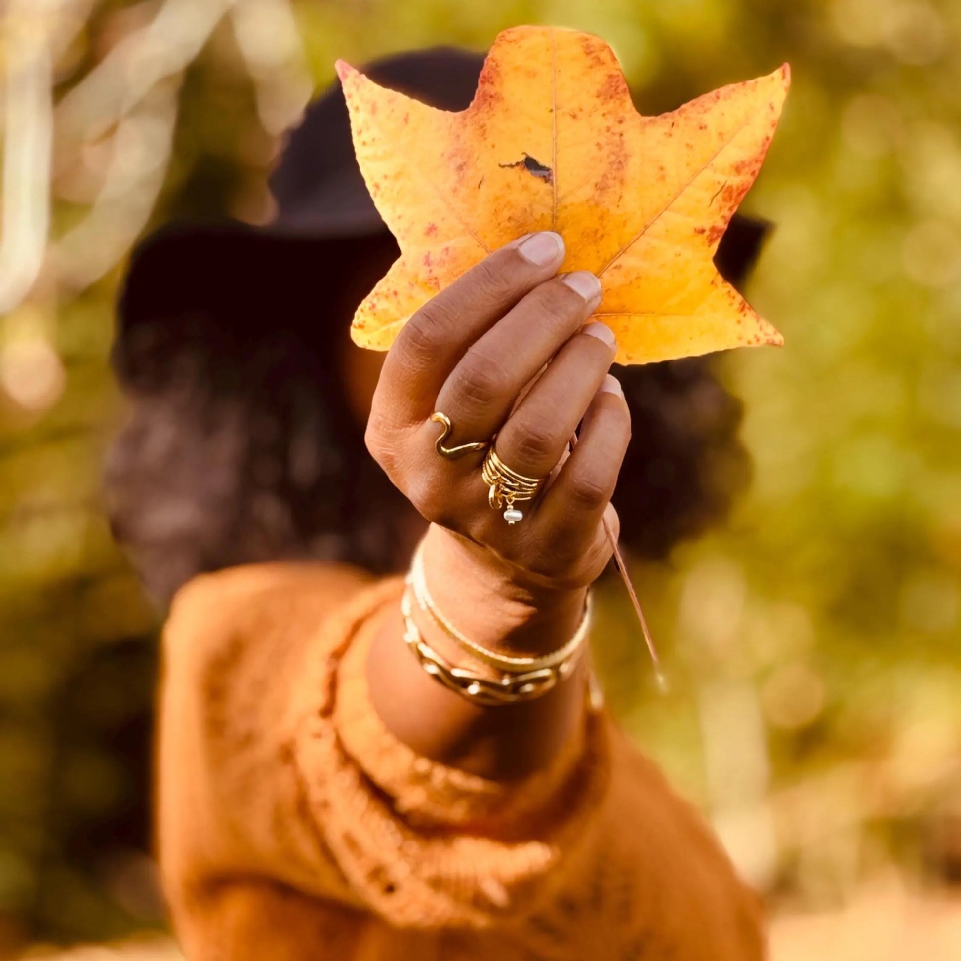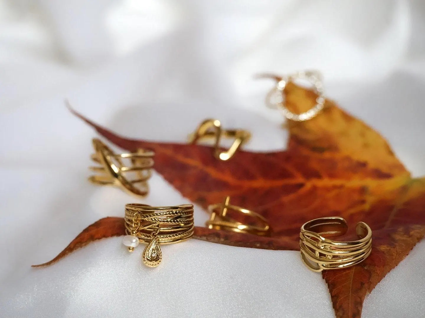La bague ÉCLAT séduit par ses breloques délicates, une perle de nacre naturelle et une goutte dorée qui captent la lumière.