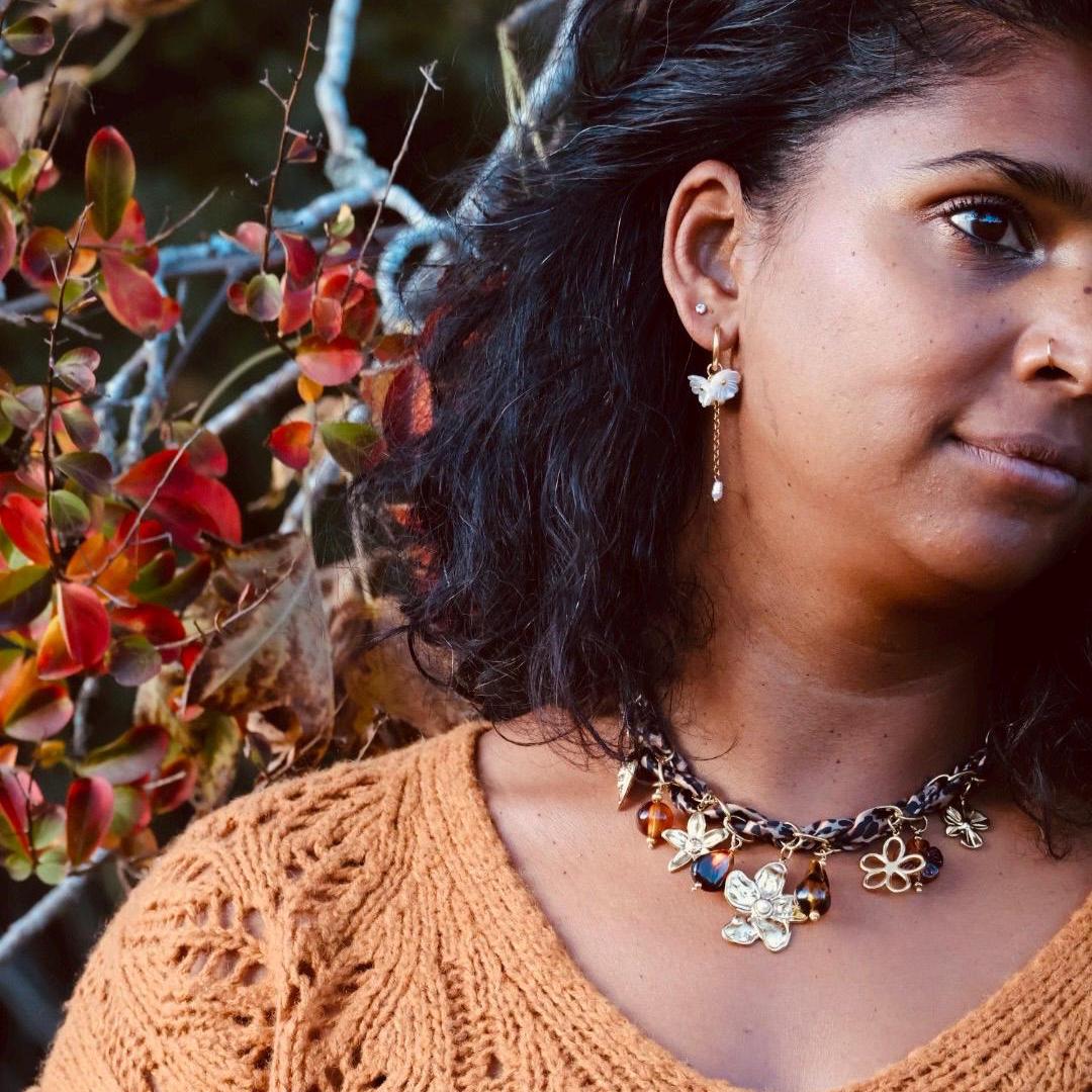 Leur créole dorée accueille des pétales nacrés prolongés d’une chaîne fine ornée de perles.