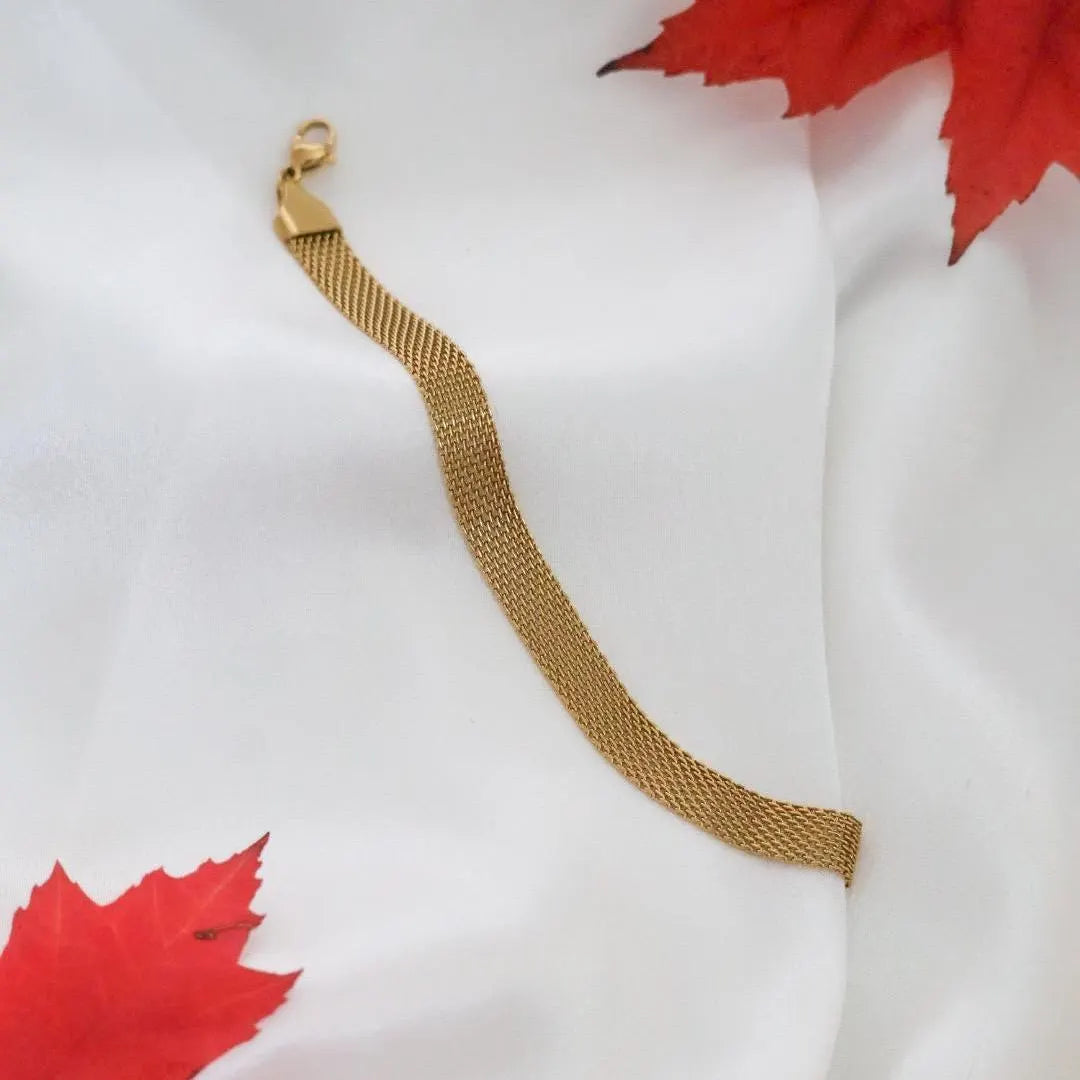 Sa maille souple texturée en acier inoxydable doré épouse le poignet avec finesse pour un rendu moderne et intemporel.