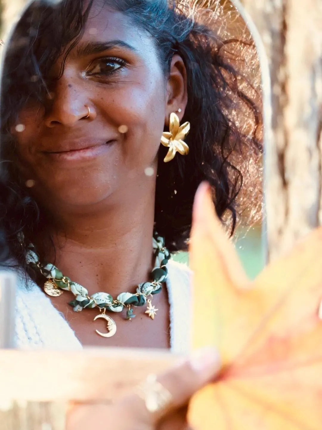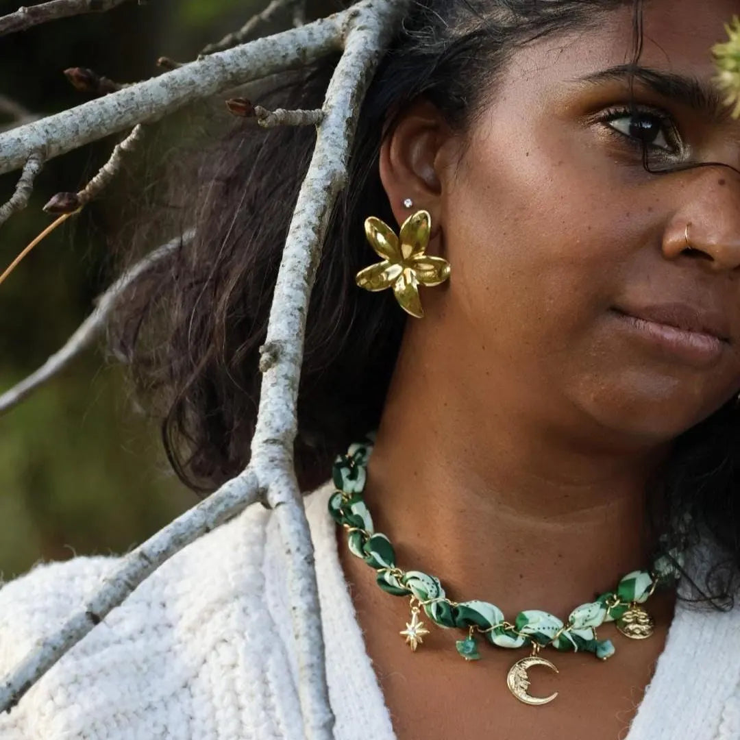 Le collier EDEN marie tissu tressé vert et beige à une chaîne dorée ornée de charms lune, étoile et disque texturé.