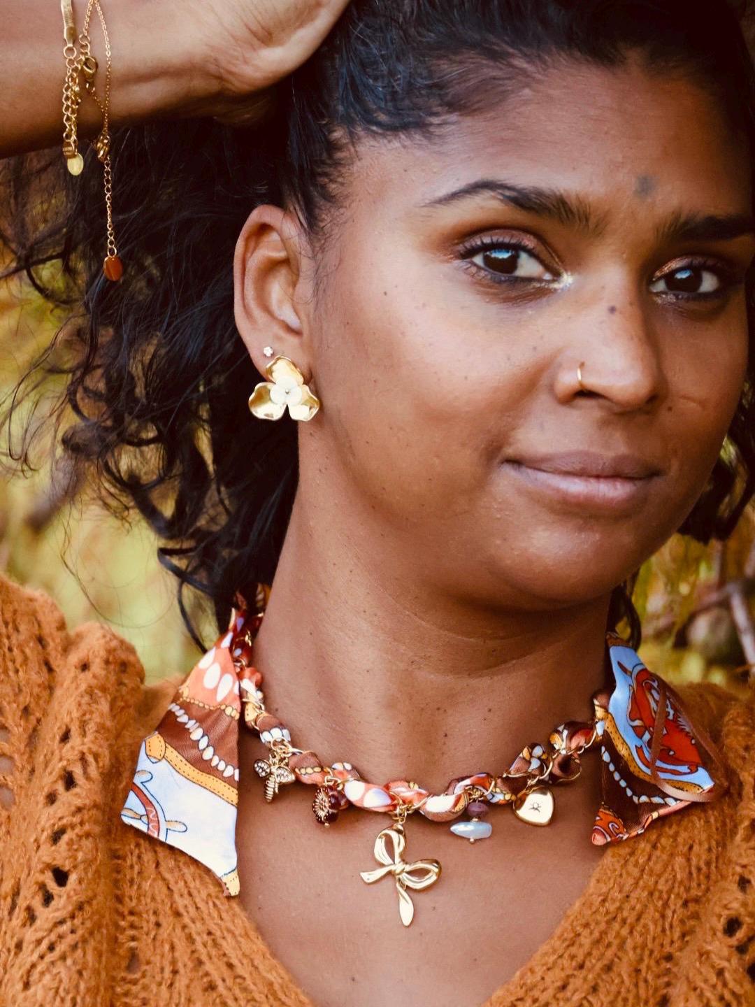 Le collier NOVA marie un foulard coloré à une chaîne dorée en acier inoxydable, ornée de charms fantaisie.