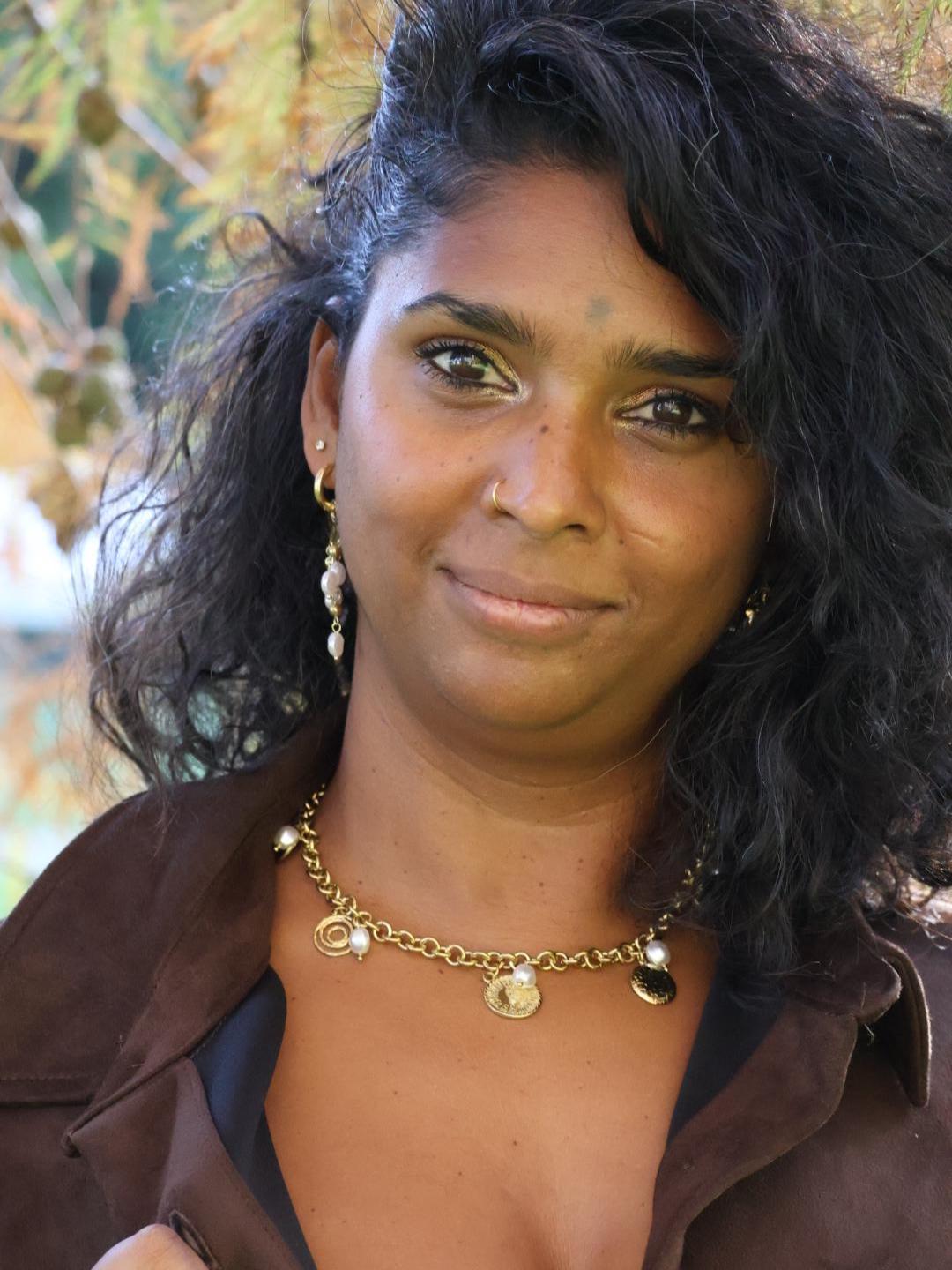 Le collier SOLA illumine votre style avec sa chaîne dorée jaseron ornée de perles blanches et de pampilles soleil, lune et étoiles.