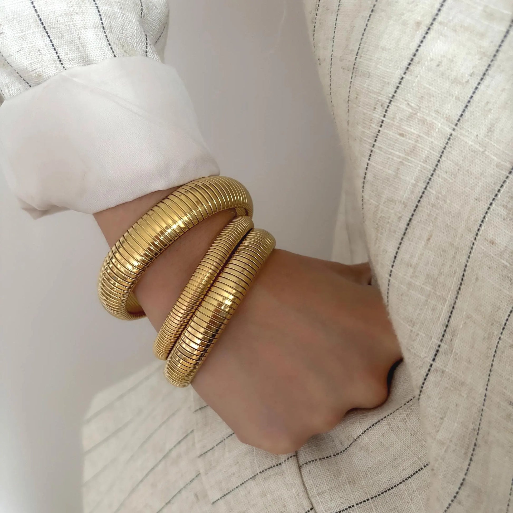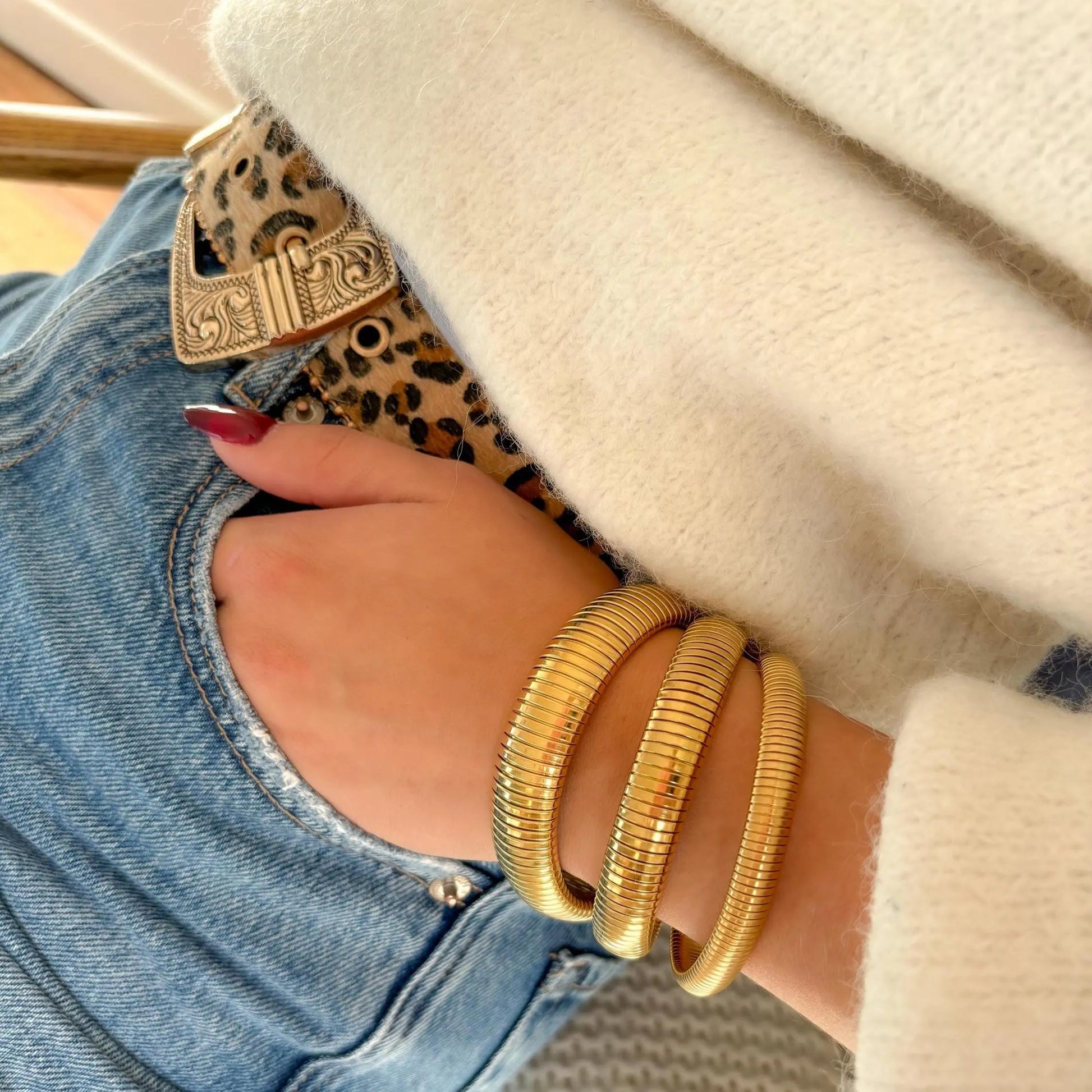 Fabriqués en acier inoxydable doré, ils se distinguent par leurs intercalaires délicatement texturés qui captent la lumière à chaque mouvement.